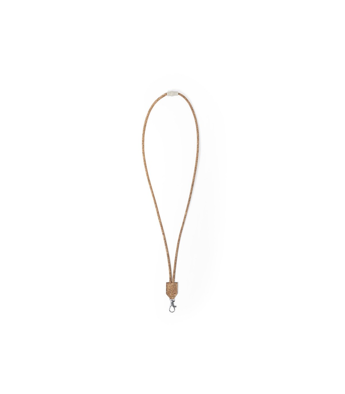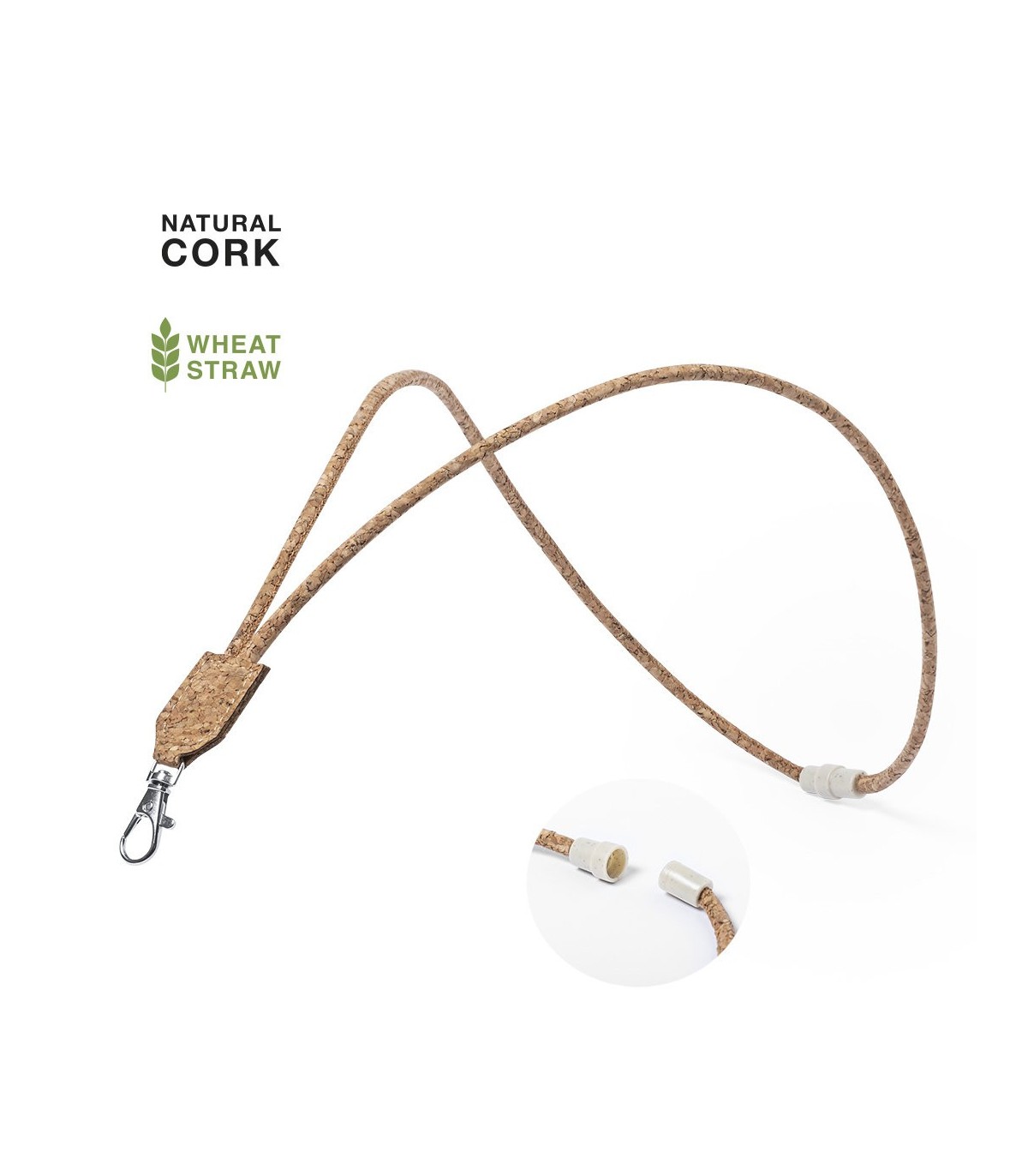 Lanyard de línea ecológica fabricado en corcho natural de acabado tubular. Con cierre de seguridad para cuello en caña de trigo/PP y mosquetón metálico. Incluye pastilla central en corcho para impresión.