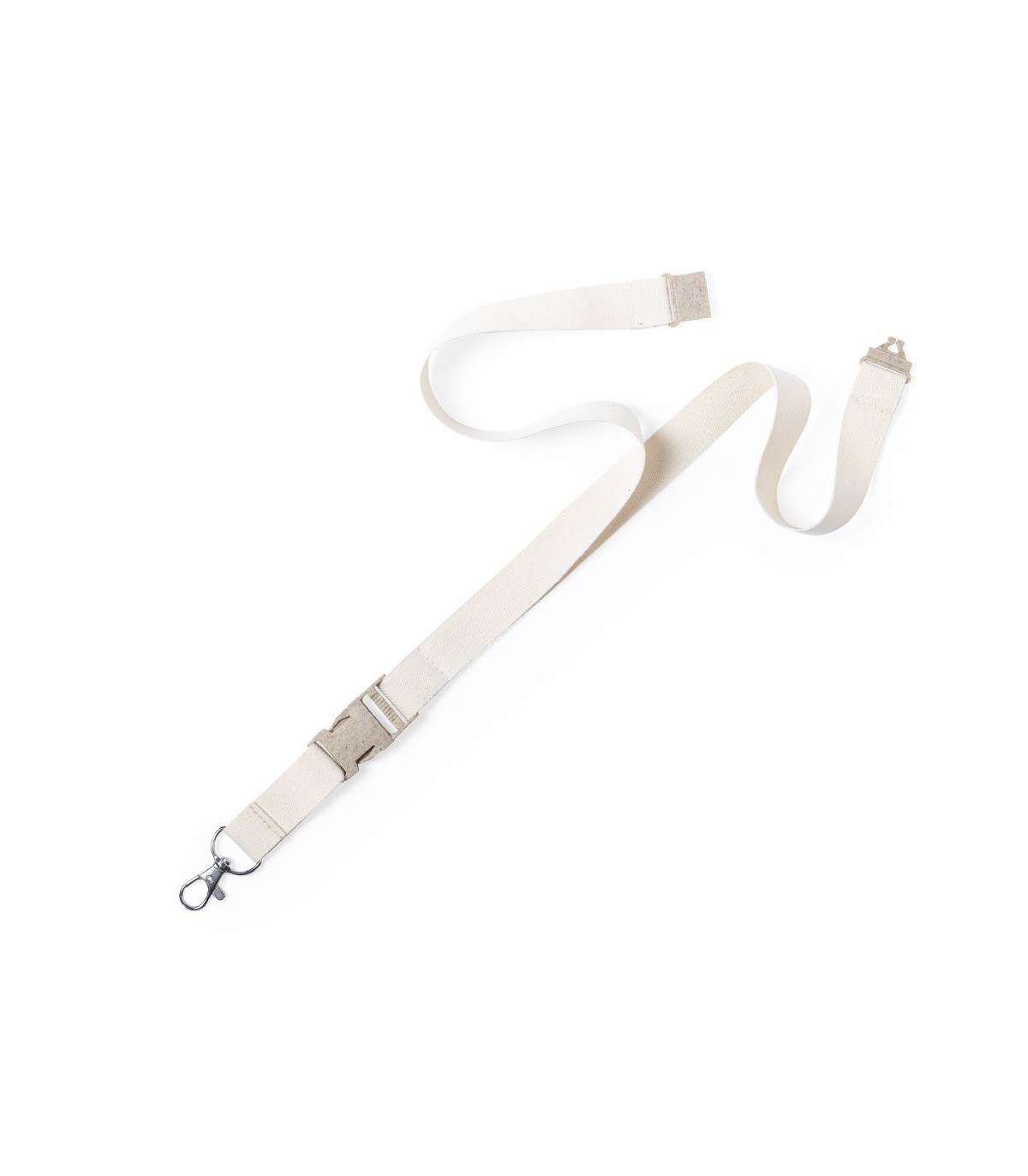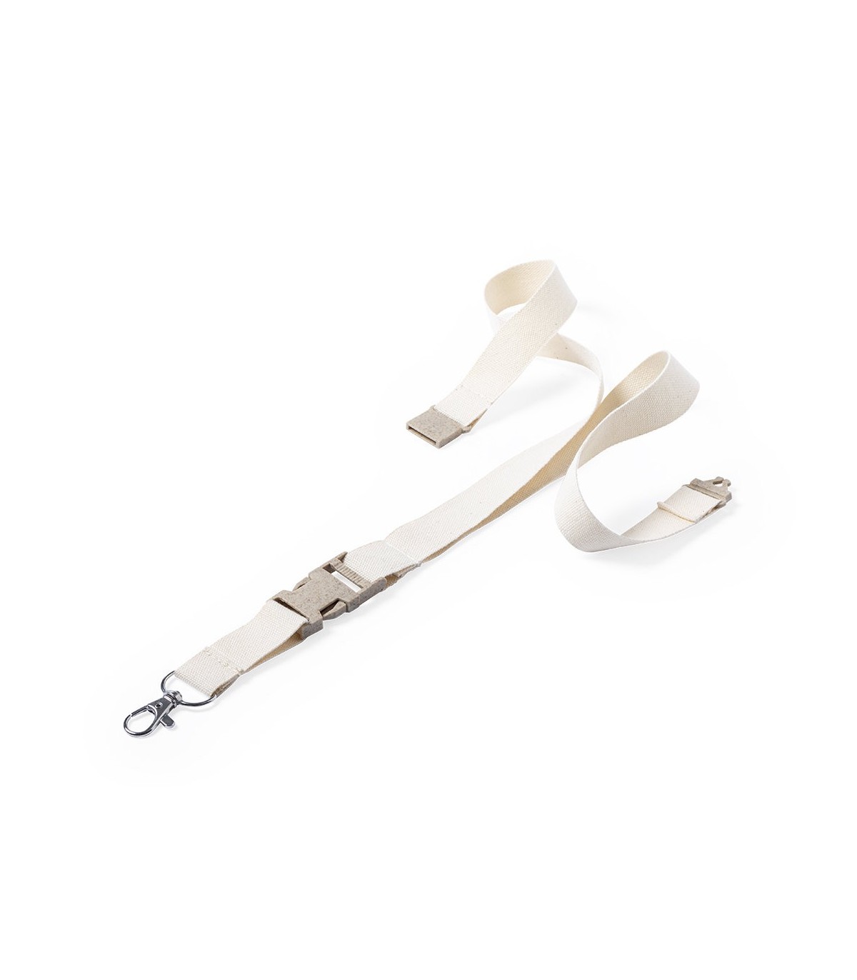 Lanyard de línea ecológica en material 100% algodón. Hebilla y cierre de seguridad en cuello de caña de trigo/PP, para así fomentar la utilización de materias primas naturales y reducir las emisiones contaminantes. Con mosquetón metálico giratorio y disponible en color natural.
