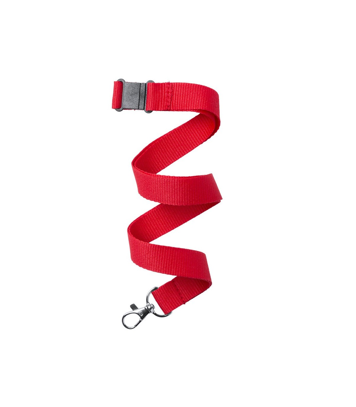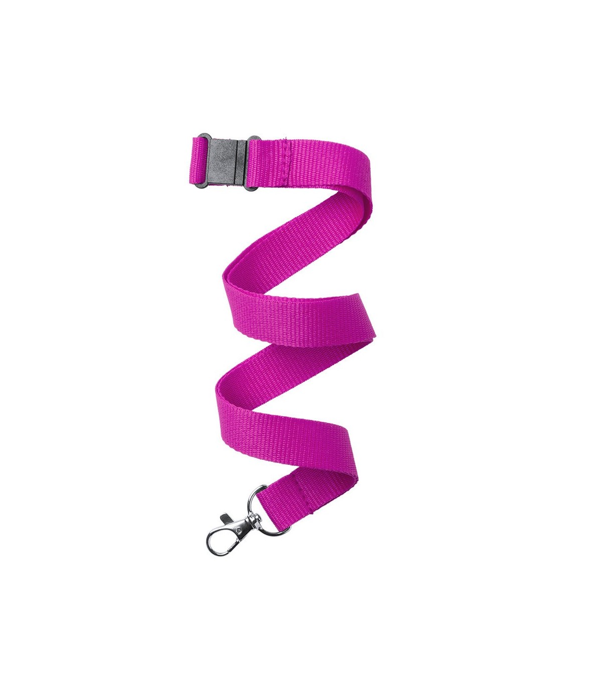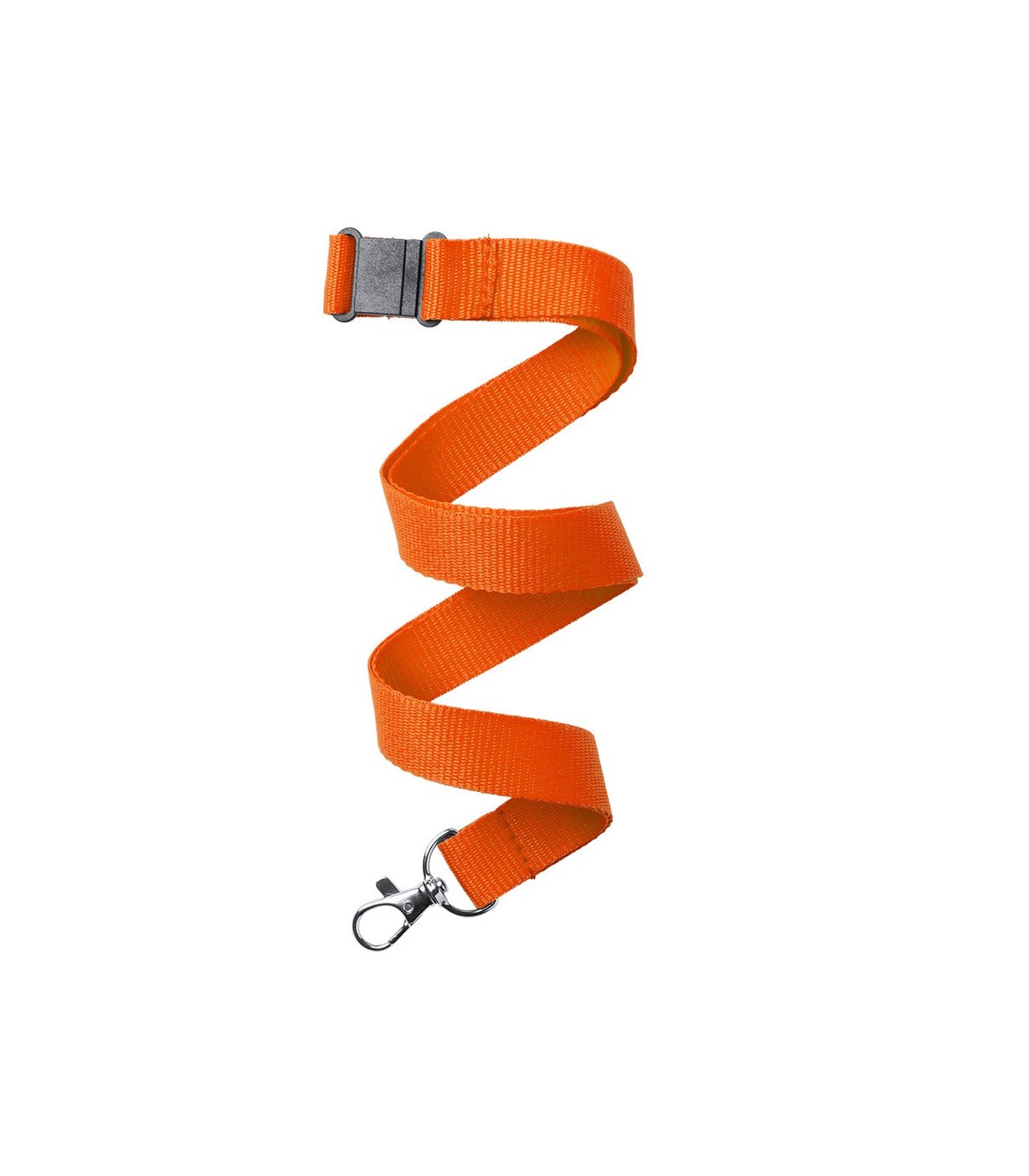 Lanyard en resistente poliéster, con accesorio de seguridad en el cuello y mosquetón metálico. Disponible en variada gama de colores vivos.