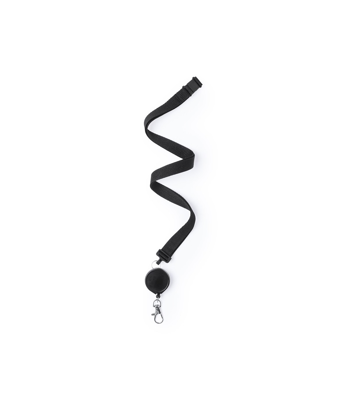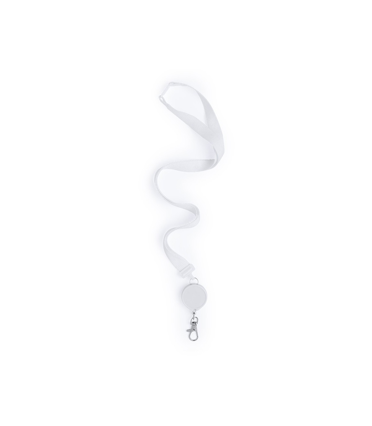 Práctico lanyard en poliéster con accesorio extensible. Accesorio de seguridad en el cuello y accesorio retráctil extensible con clip de ajuste en un lado, dejando el otro lado libre para el logotipado. Mosquetón metálico. Conjunto disponible en colores blanco y negro.