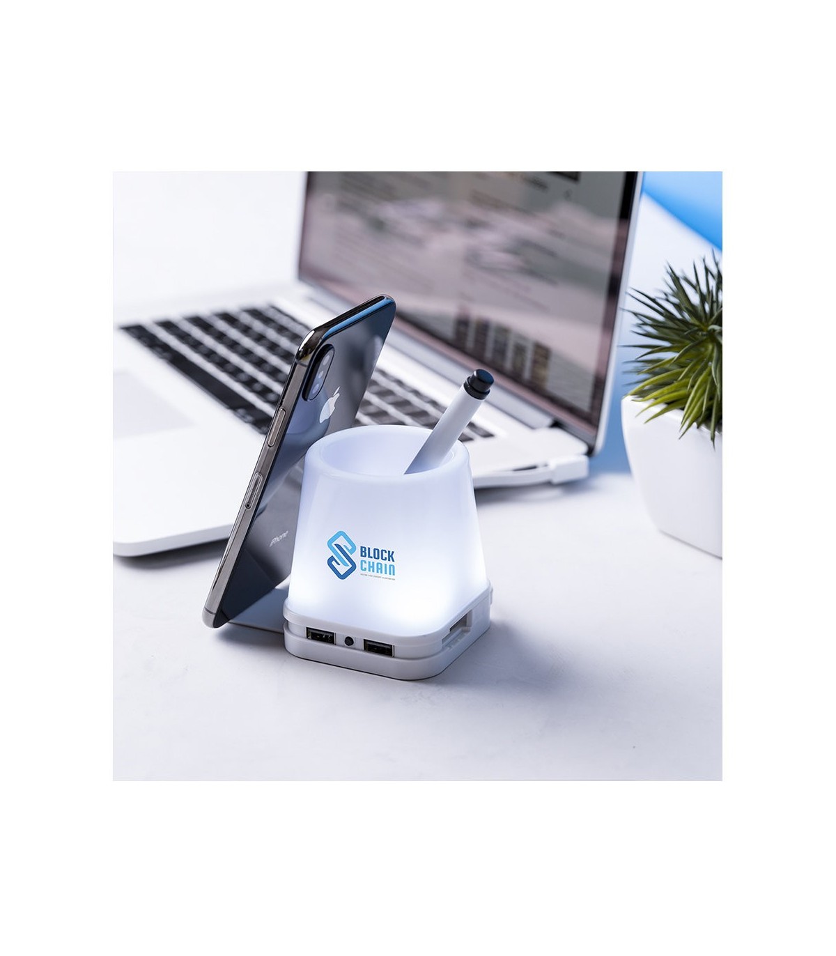 Original lapicero con puerto USB integrado. Retroiluminado por luz led, con 2 posiciones de iluminación y cuerpo en elegante color blanco para fácil marcaje. Incluye 4 puertos USB 2.0. Embalaje en empaque individual.