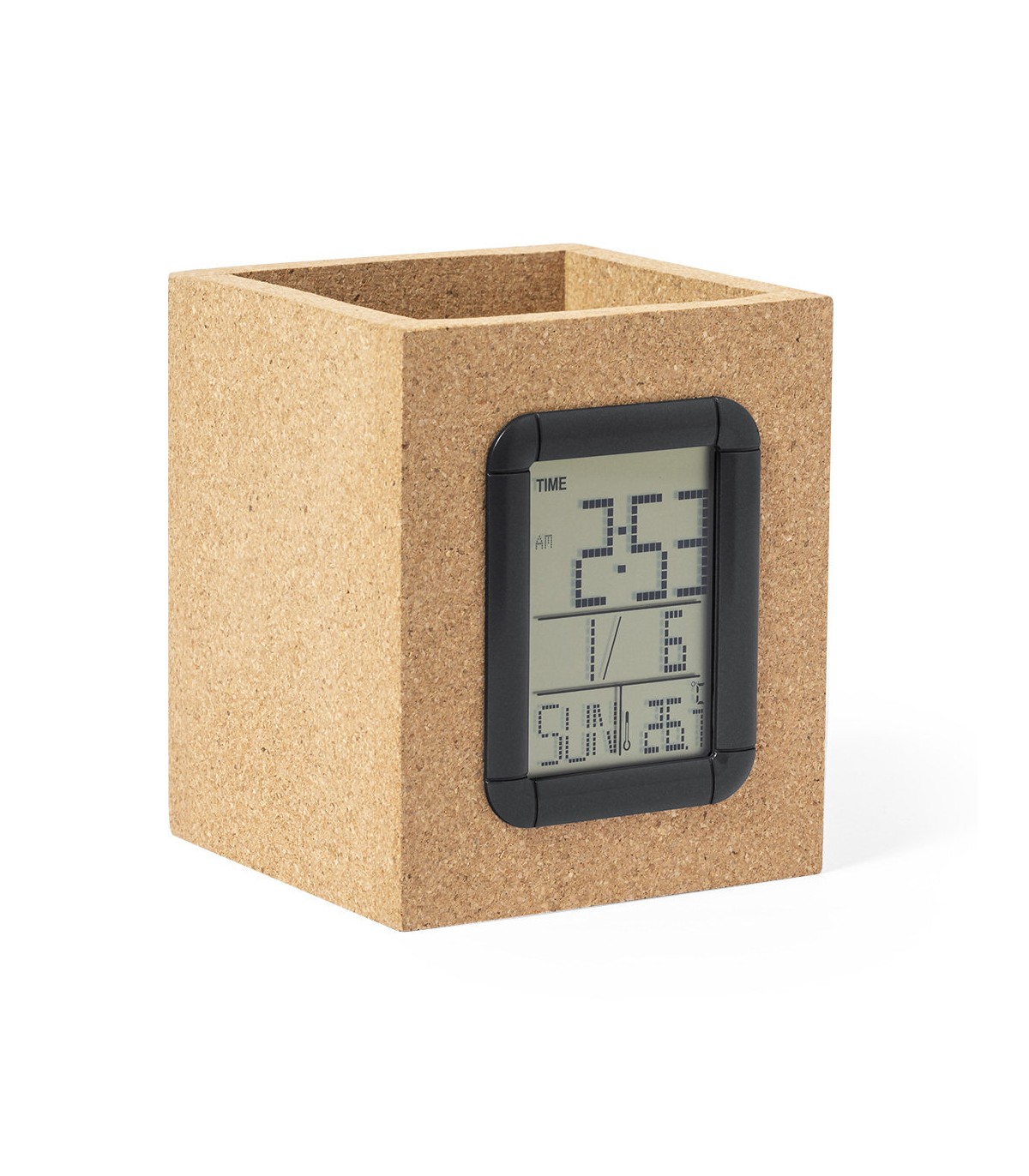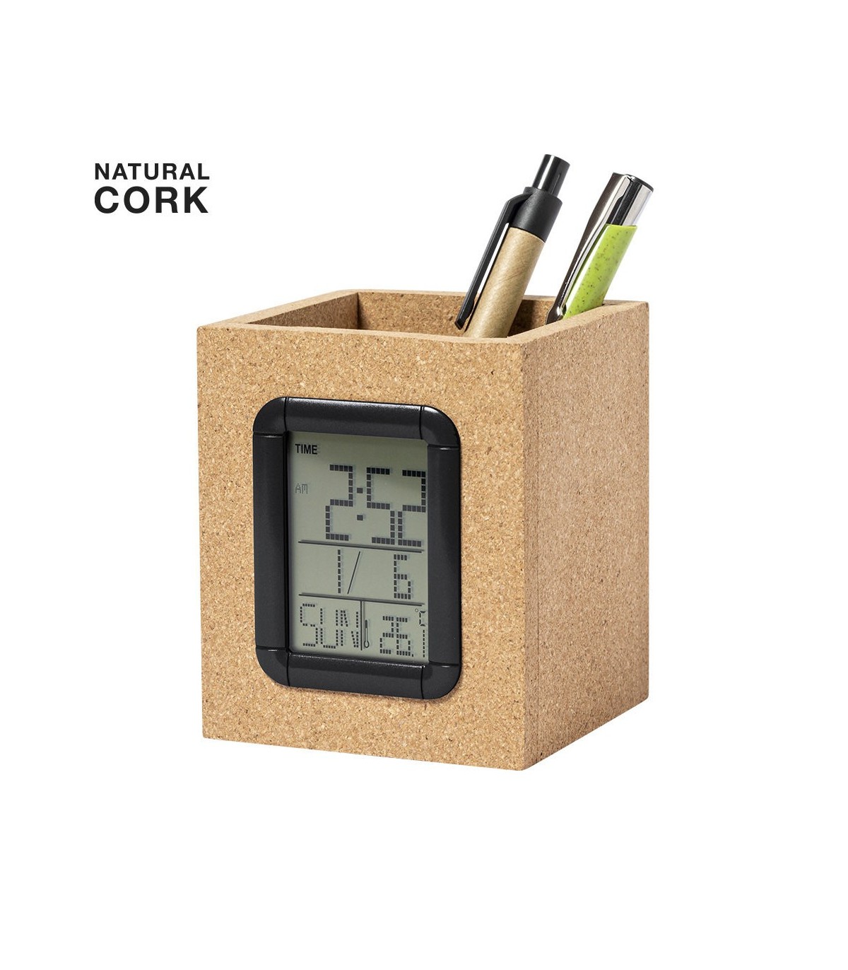 Lapiceros ecológicos personalizados con reloj multifunción integrado. Hecho en corcho natural, con funciones termómetro, calendario y alarma.
