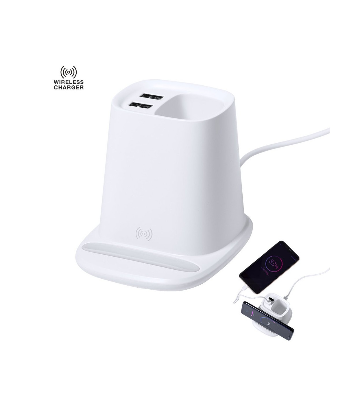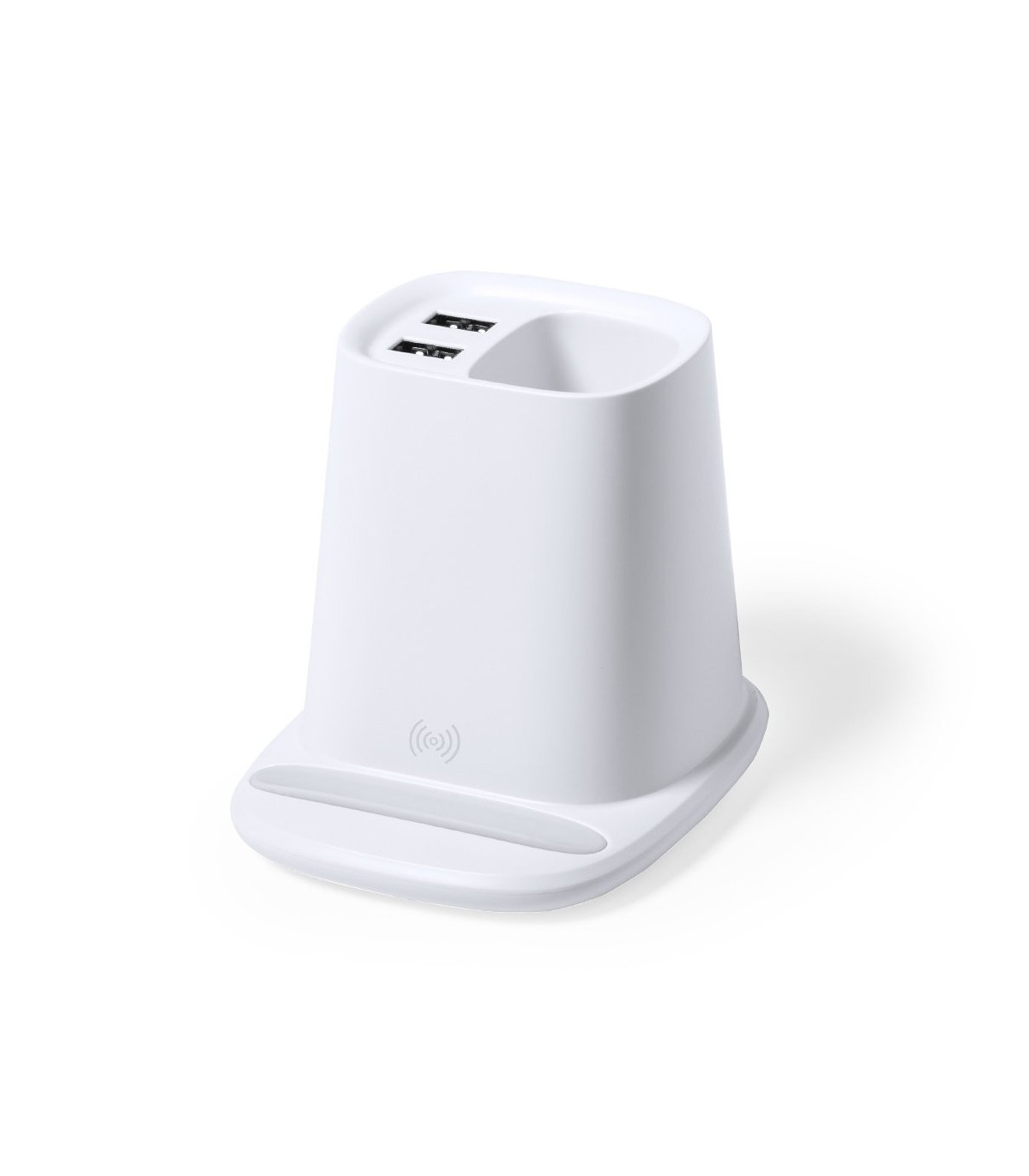 Lapicero multifunción 4 en 1, fabricado en resistente material ABS de color blanco. Con funciones lapicero, soporte para smartphone, cargador inalámbrico 5W y 2 salidas USB de 2.000 mA. Puerto USB inferior, apto para transferencia de datos. Compatible con smartphones con tecnología de carga inalámbrica. Incluye cable tipo C de 1 metro de largo y viene presentado en atractiva caja de diseño. Disponible manual de instrucciones en español e inglés.