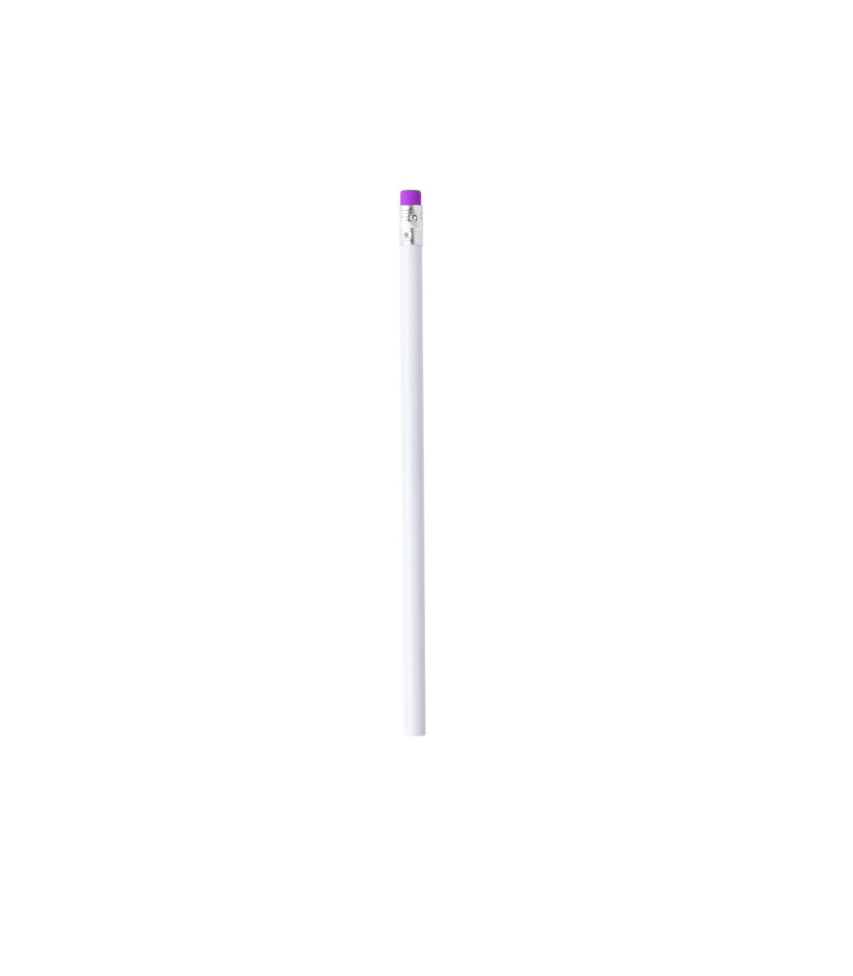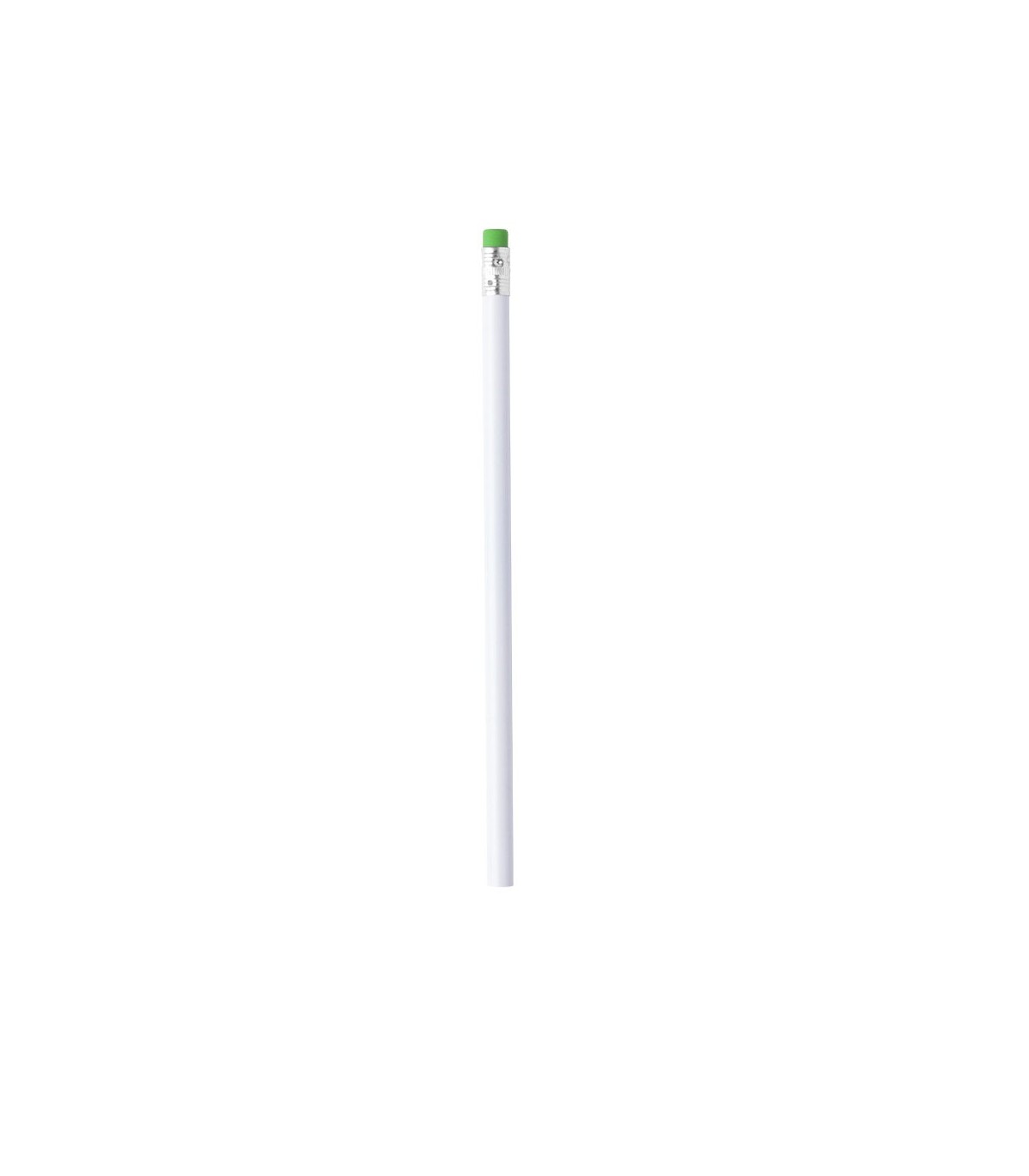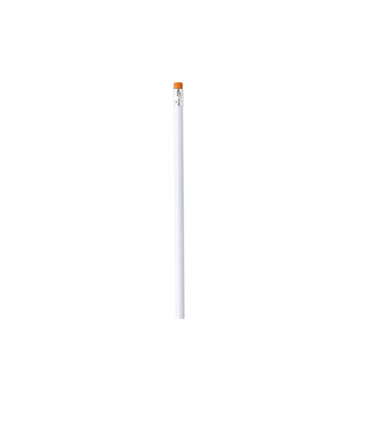Elegante lápiz con cuerpo acabado en color blanco y goma en variados colores. Mina de color negro y punta sin afilar