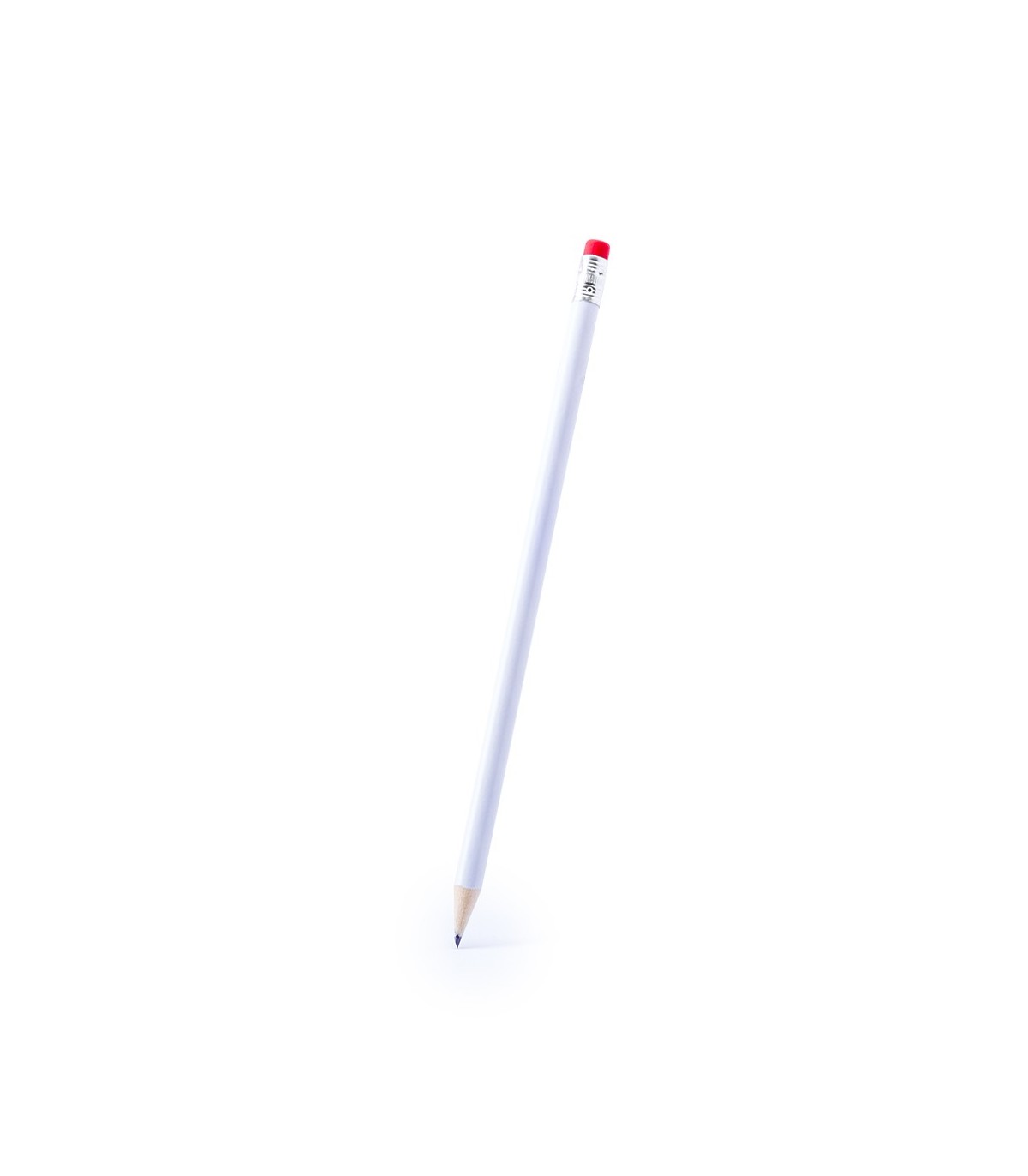 Originales lápices de madera en color blanco y goma de borrar en llamativos colores, personalizados con tu logo de empresa para eventos.