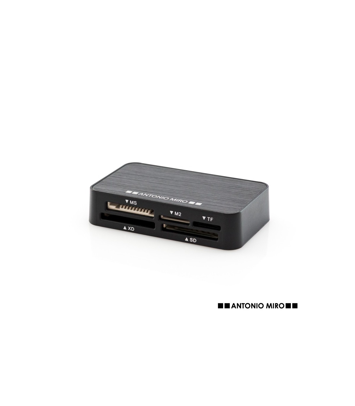 Lector de tarjetas de Antonio Miró con parte superior acabada en aluminio de elegante color negro. Compatible con tarjetas MS, M2, TF, XD, SD y CF. Presentado en caja individual con logotipo de la marca e interior troquelado en suave espuma.