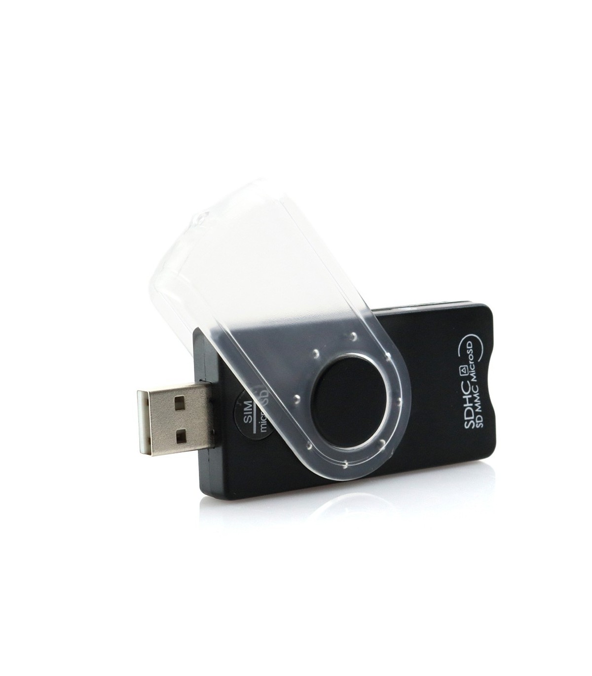 Práctico lector de DNI/Smart Card con conexión USB 2.0. De apertura giratoria y diseño minimalista, integra además ranuras para tarjetas de memoria tipo MS, M2, SD, MiniSD, SmartCard, SIM y MicroSD. Compatible con Windows y macOS. Embalaje en empaque individual de cartón en acabado negro satinado.