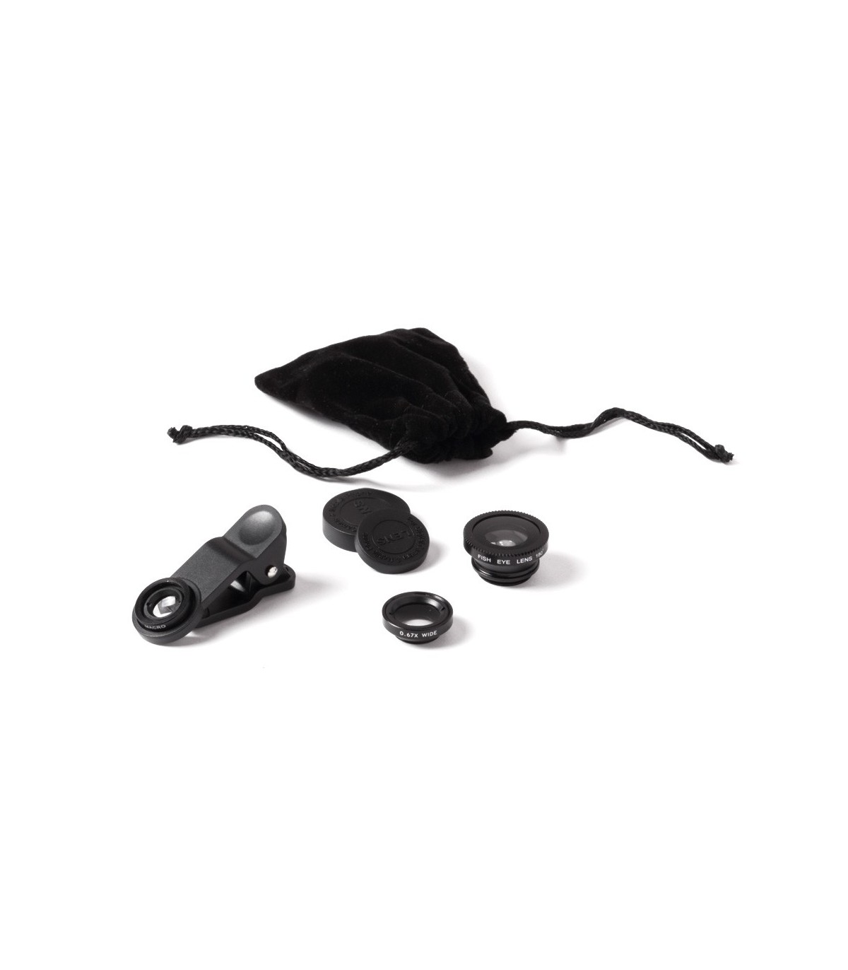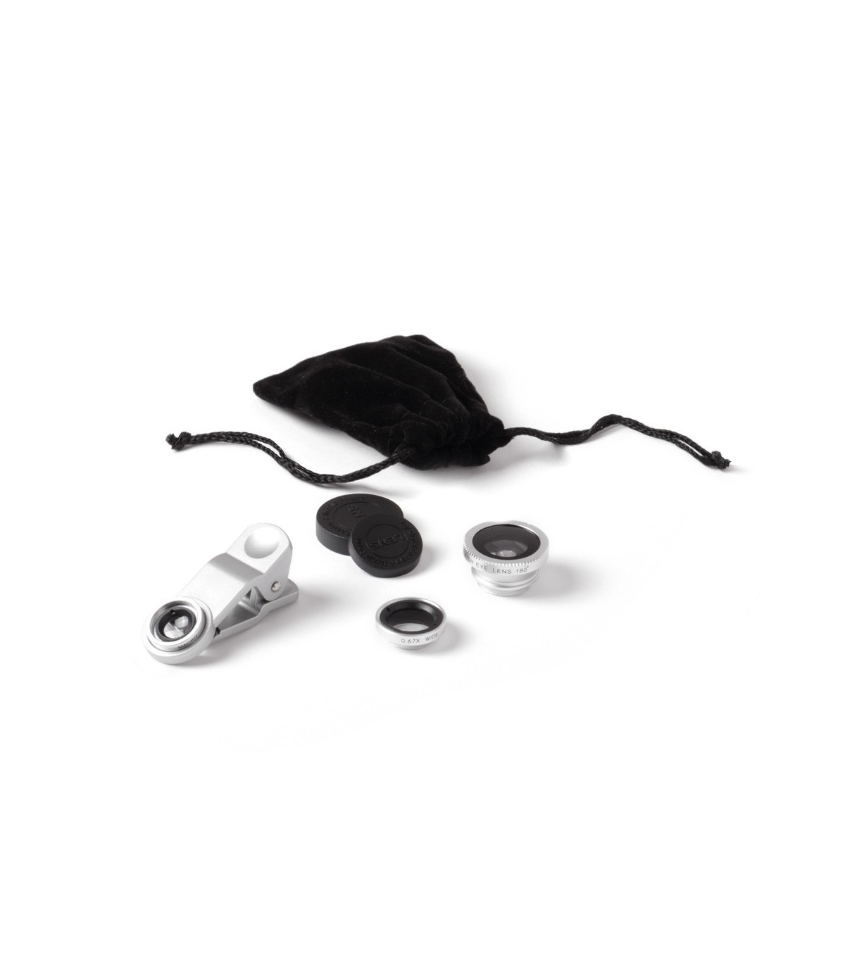 Set de 3 lentes universales para smartphone, ajustables a la cámara mediante pinza. Lentes de aluminio y cristal, con efectos -ojo de pez-,-macro- y -gran angular-, con paño limpiador de microfibra y presentadas en una bolsita de terciopelo con cordones autocierre. Set presentado en atractiva caja de diseño.