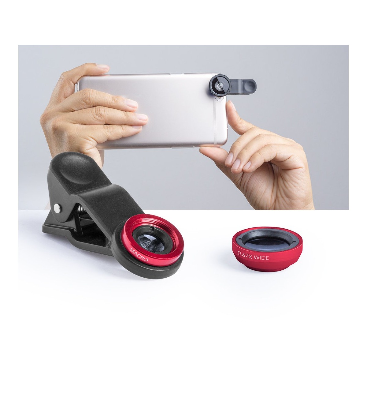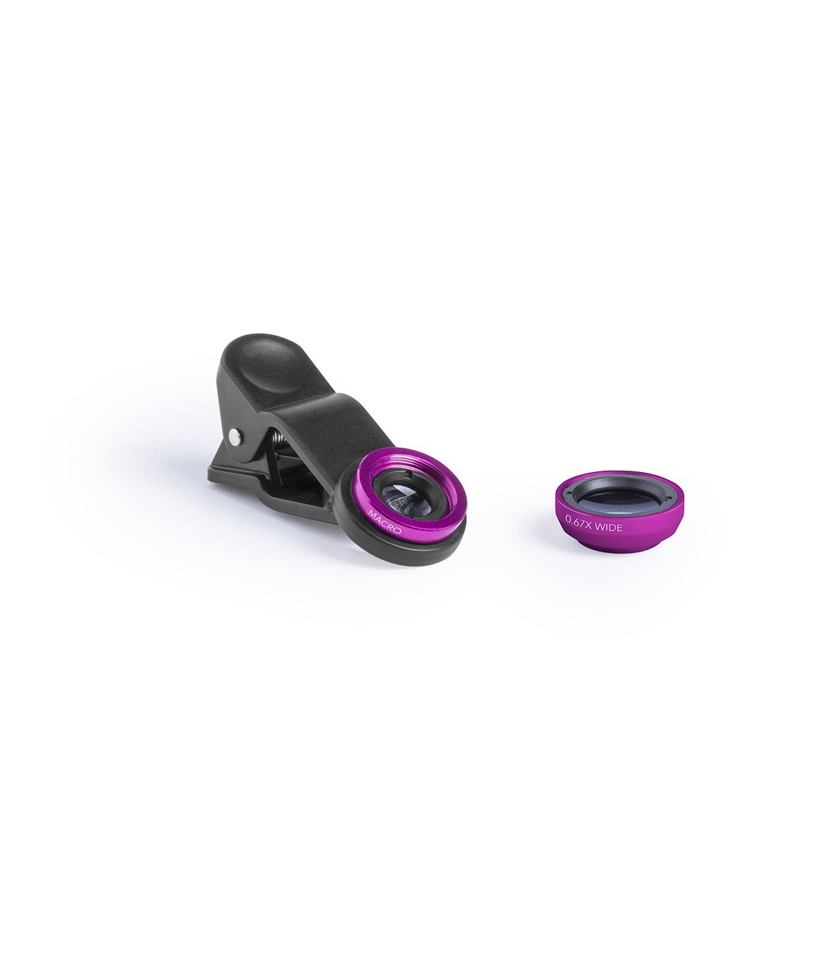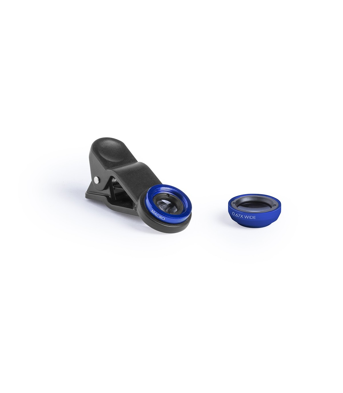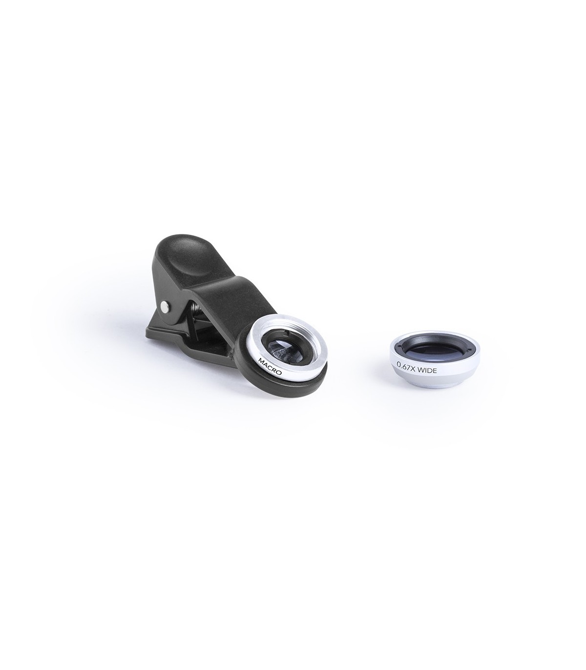 Set de lentes universales para smartphone, ajustables a la cámara mediante pinza. Lentes de aluminio y cristal, con efectos -macro- y -gran angular-, con paño limpiador de microfibra y presentadas en una bolsita de terciopelo con cordones autocierre. Set presentado en atractiva caja de diseño.