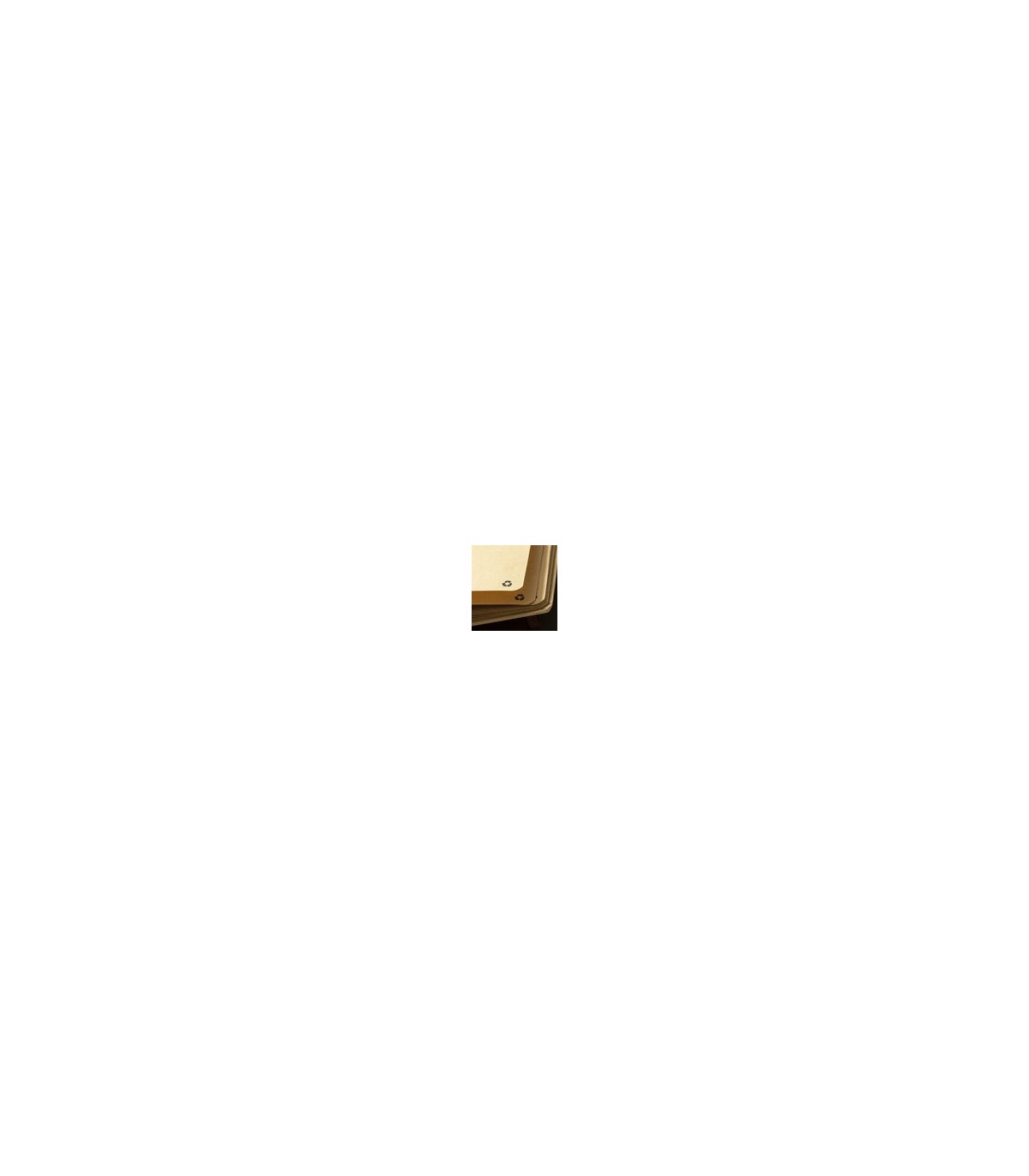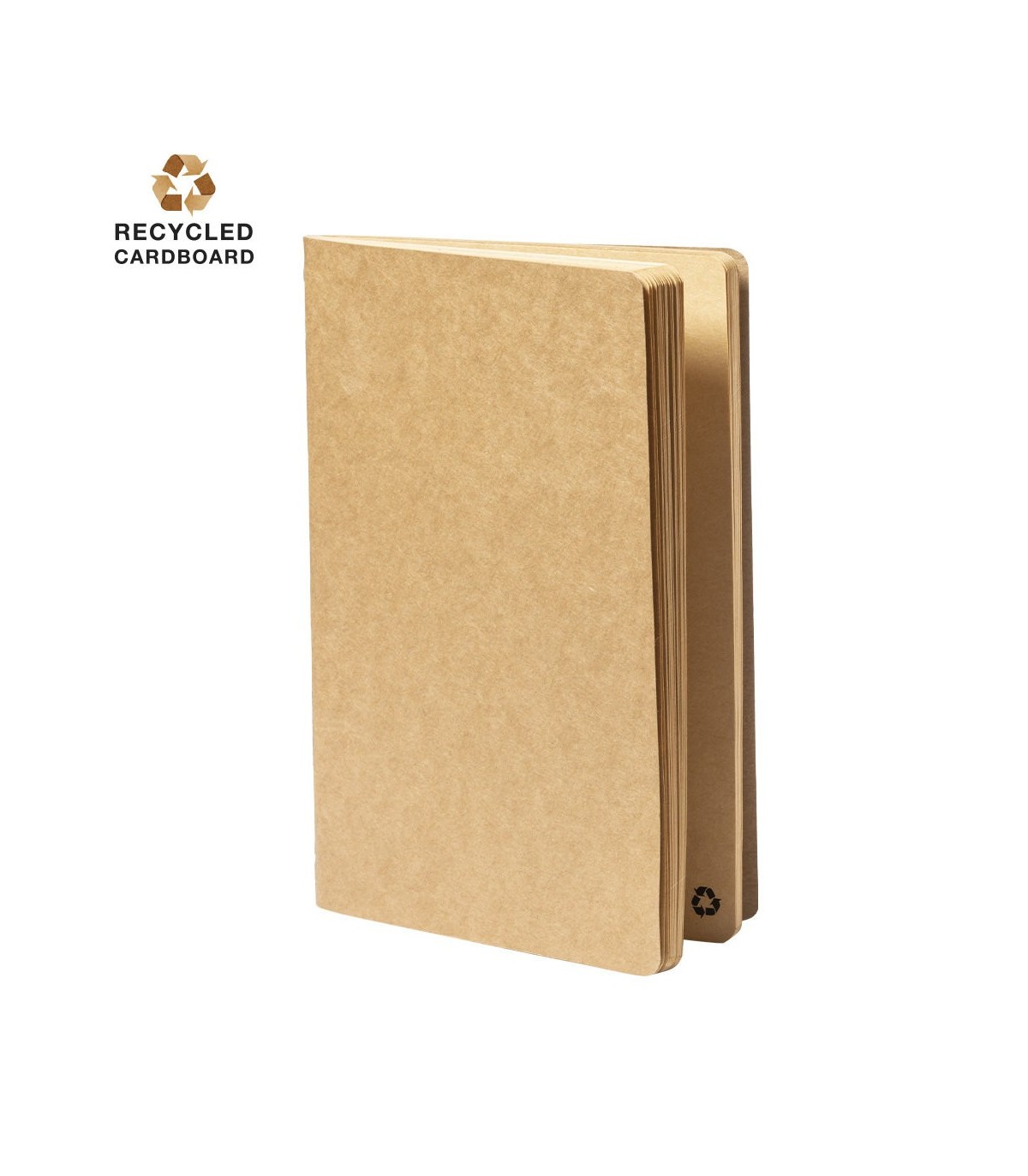 Libreta A5 de fabricación ecológica, con tapas blandas en resistente cartón reciclado. 60 hojas lisas de acabado kraft y distintivo reciclado.