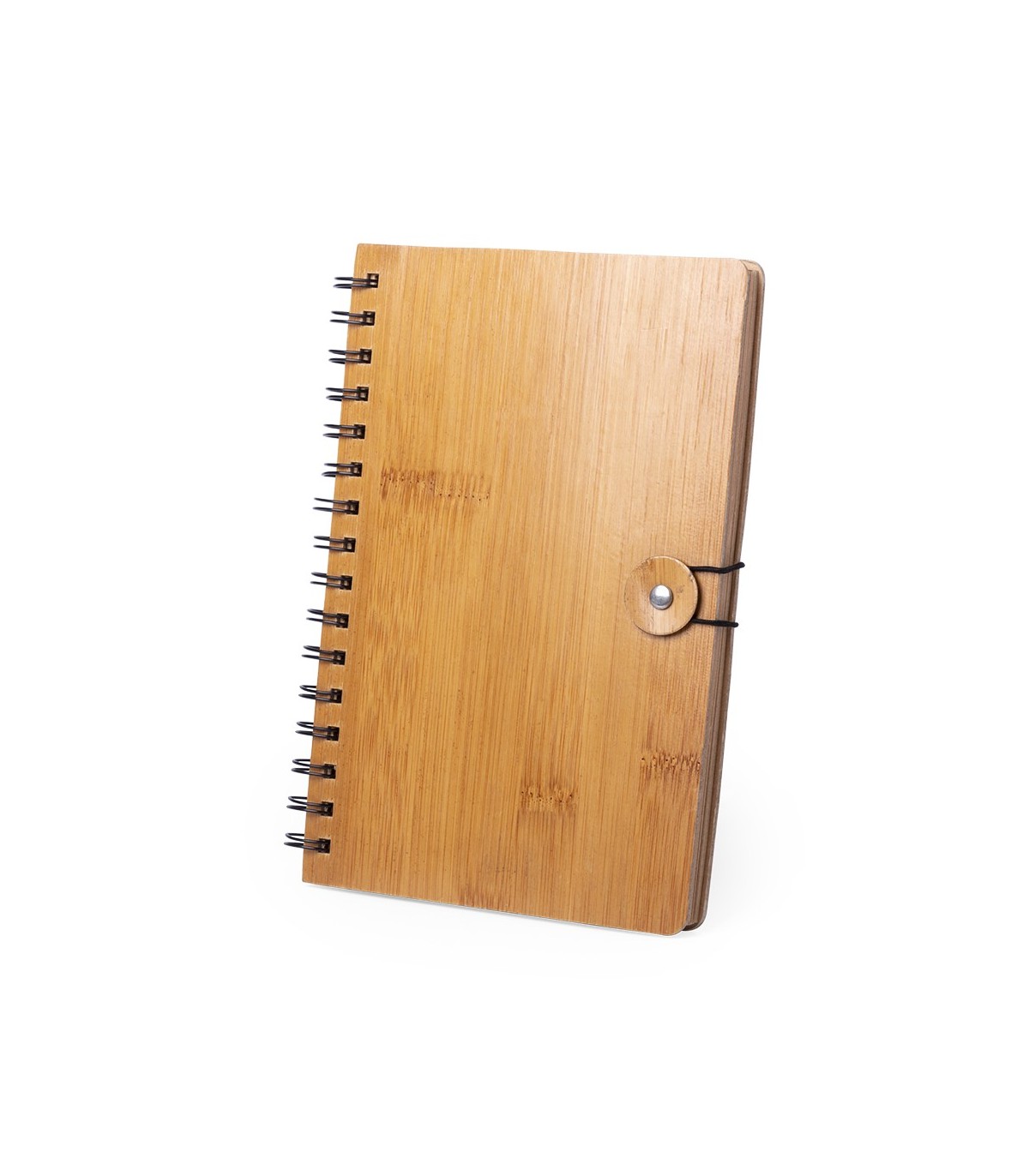 Novedosas libretas fabricadas en bambú con tapas rígidas de bambú y original cierre elástico. Incluye 80 hojas con disposición a una raya y diseño eco.
