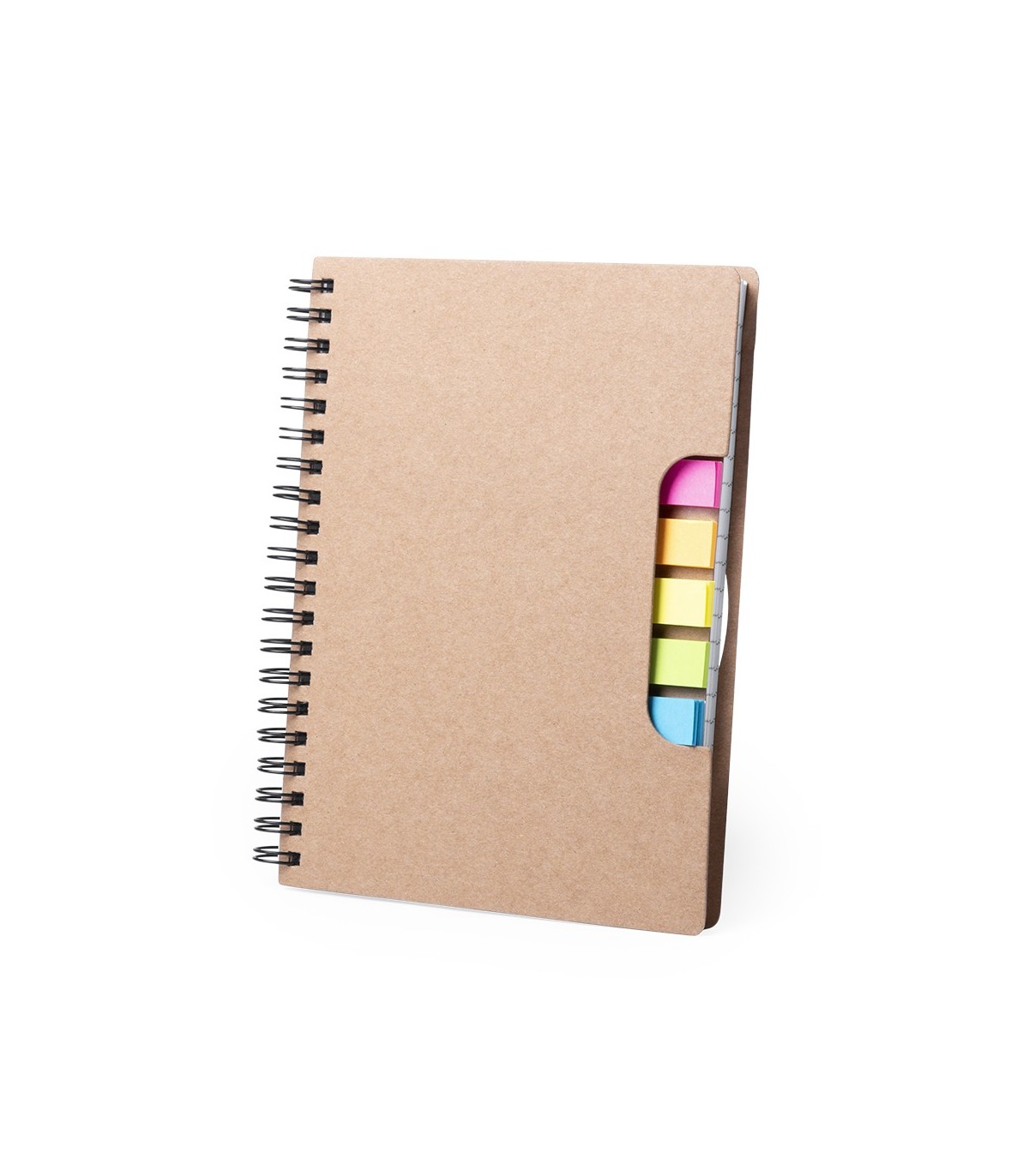 Libreta de anillas personalizadas con tapas en cartón reciclado, portada troquelada que muestra los colores de las notas adhesivas del interior.