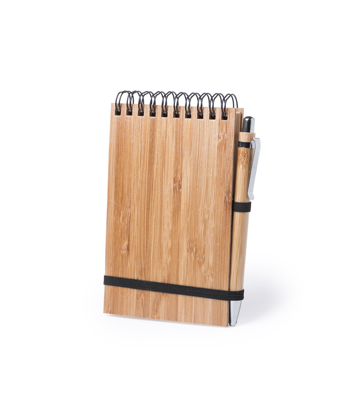 Libreta de anillas ecológicas promocionales con tapas rígidas de bambú y bolígrafo a juego, también en bambú. elástico de cierre y Bolígrafo tinta azul.