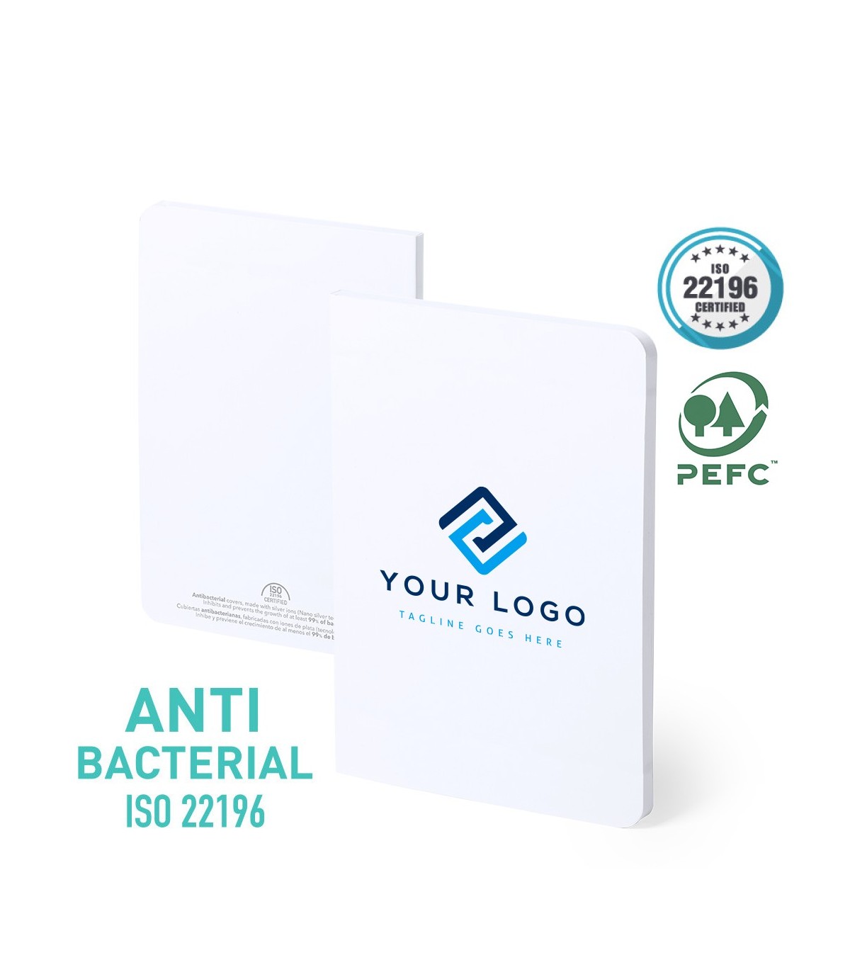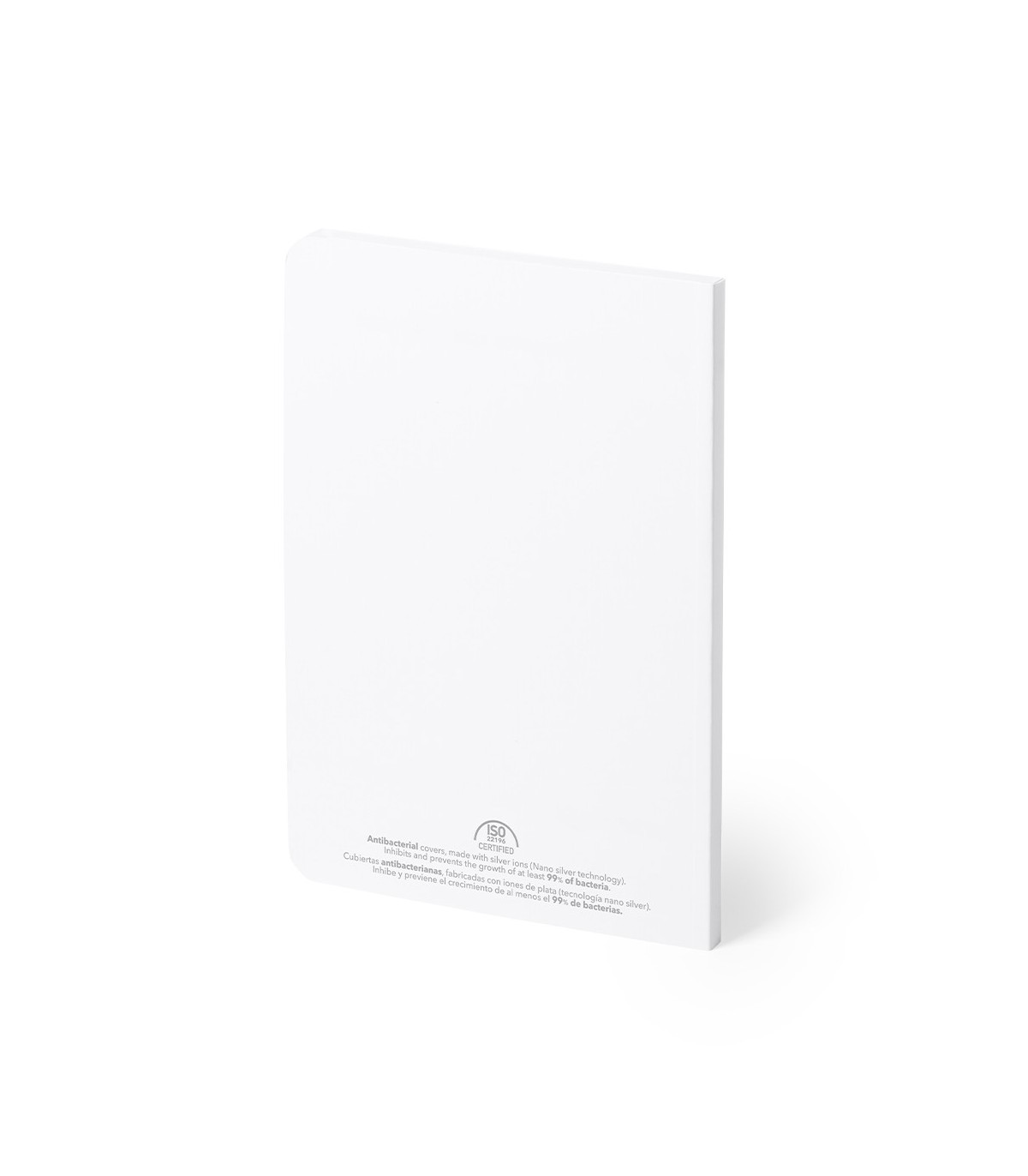 Libreta tamaño A5 con tapas antibacterianas flexibles de cartón laminado. En elegante acabado blanco mate, con encuadernación cosida. Cubiertas antibacterianas, fabricadas con agentes activos a base de plata, que inhiben y previenen el crecimiento de al menos el 99% de las bacterias. Incluye 80 hojas de papel lisas en color blanco, calidad 80g/m2. Certificación PEFC disponible.