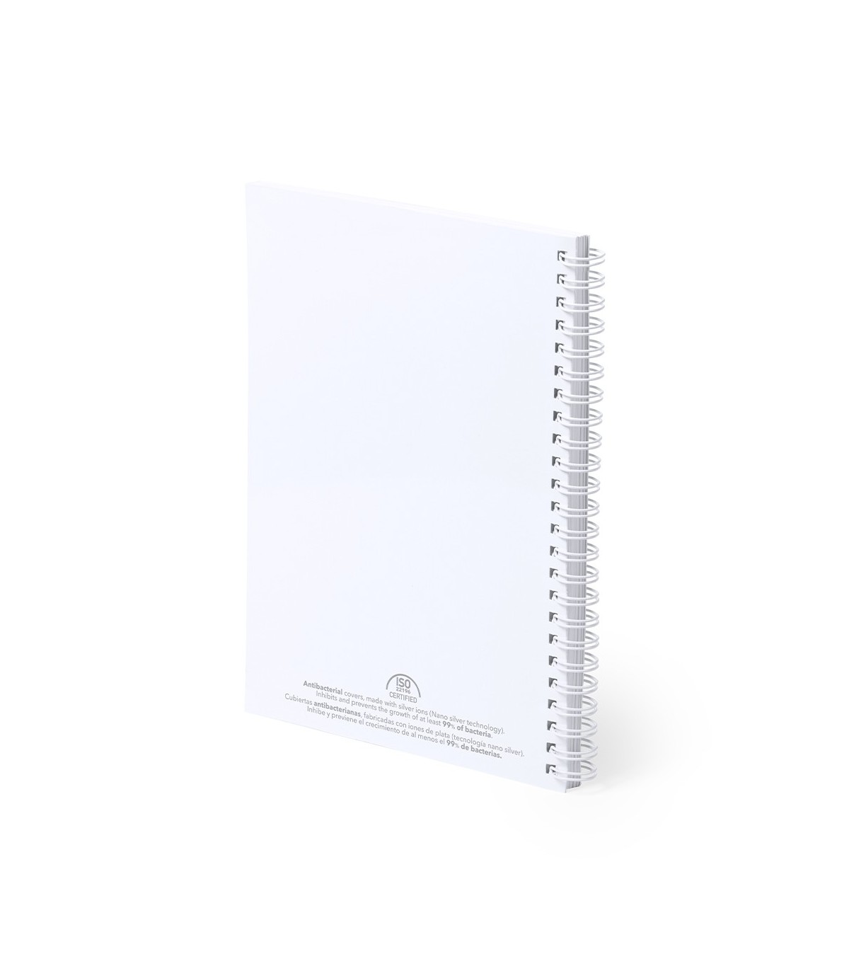 Libreta tamaño A5 con tapas antibacterianas flexibles de cartón laminado. En elegante acabado blanco mate, con anillas a juego. Cubiertas antibacterianas, fabricadas con agentes activos a base de plata, que inhiben y previenen el crecimiento de al menos el 99% de las bacterias. Incluye 80 hojas de papel lisas en color blanco, calidad 80g/m2. Certificación PEFC disponible.