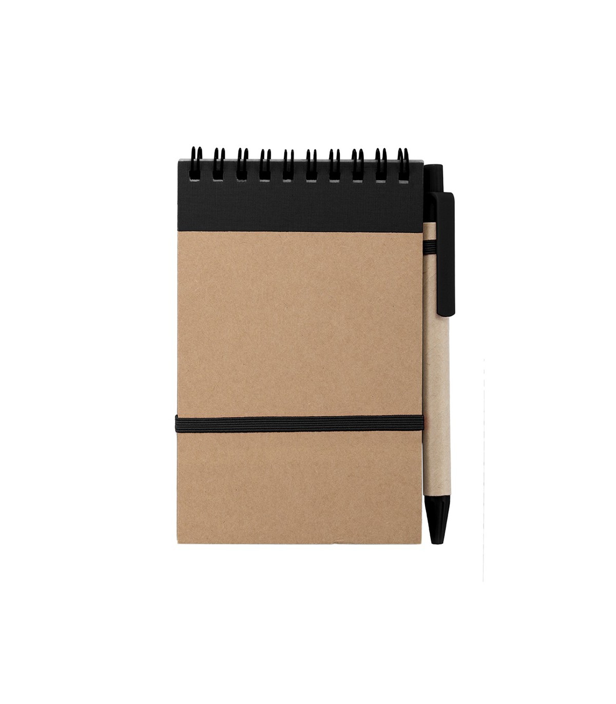 Libretas de cartón reciclado color natural con bolígrafo, portada rígida de 70 hojas personalizados en serigrafia para regalos promocionales.