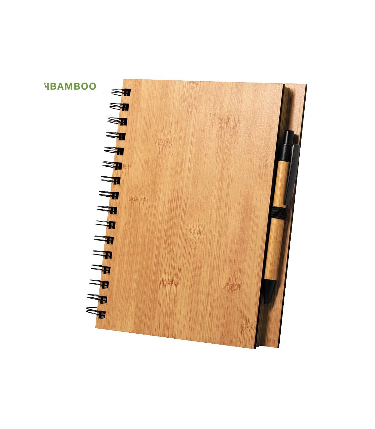 Set de libreta y bolígrafo de línea ecológica. Libreta de anillas con tapas rígidas en bambú, con soporte para el bolígrafo. De 80 hojas con diseño eco y disposición a una raya. Bolígrafo de mecanismo pulsador, con cuerpo de bambú y tinta negra.