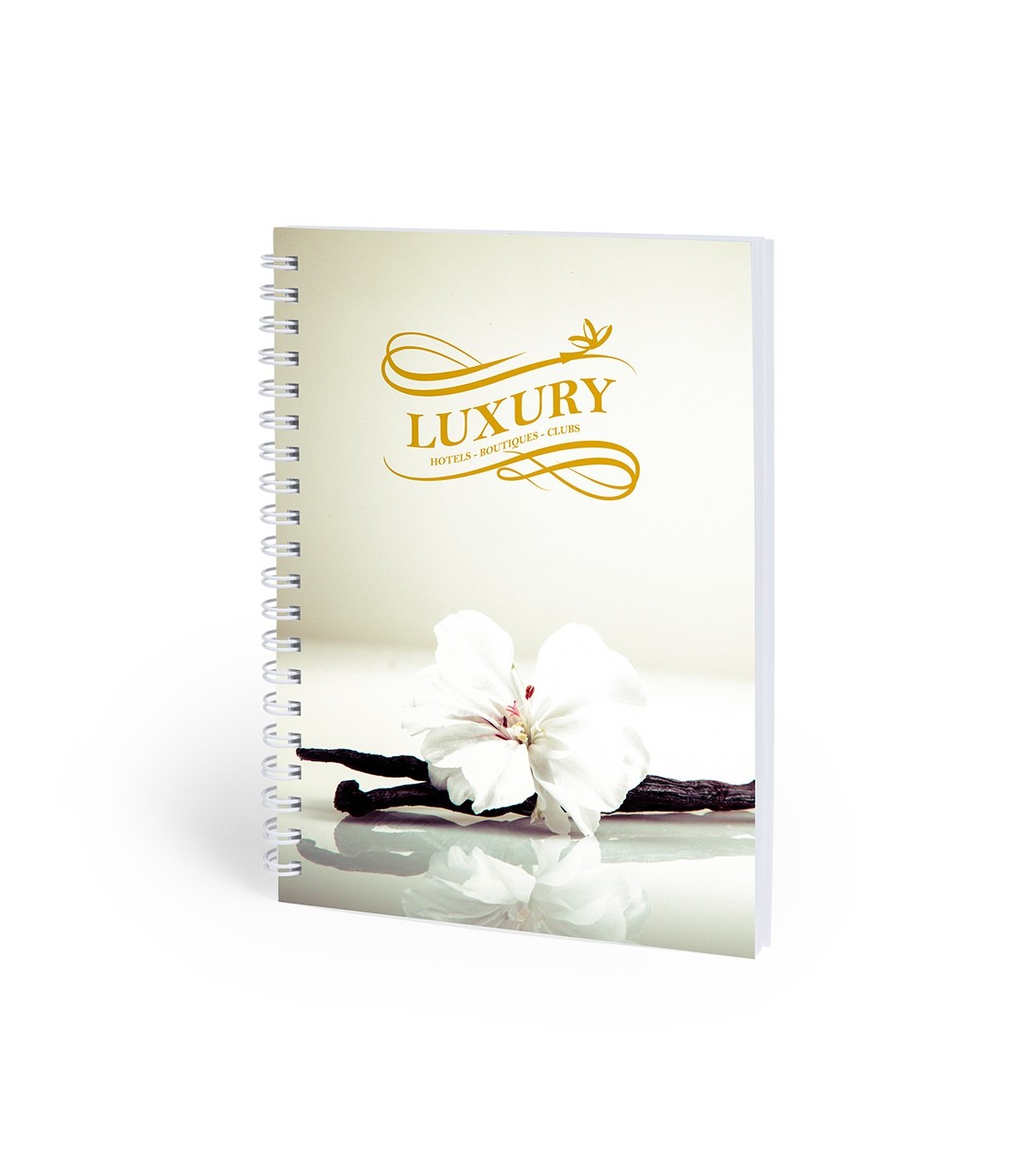 Libreta de anillas blancas con tapas de cartón rígidas de suave acabado brillante. Con 50 hojas lisas y especialmente diseñada para personalización a partir de pedidos de 250 unidades.