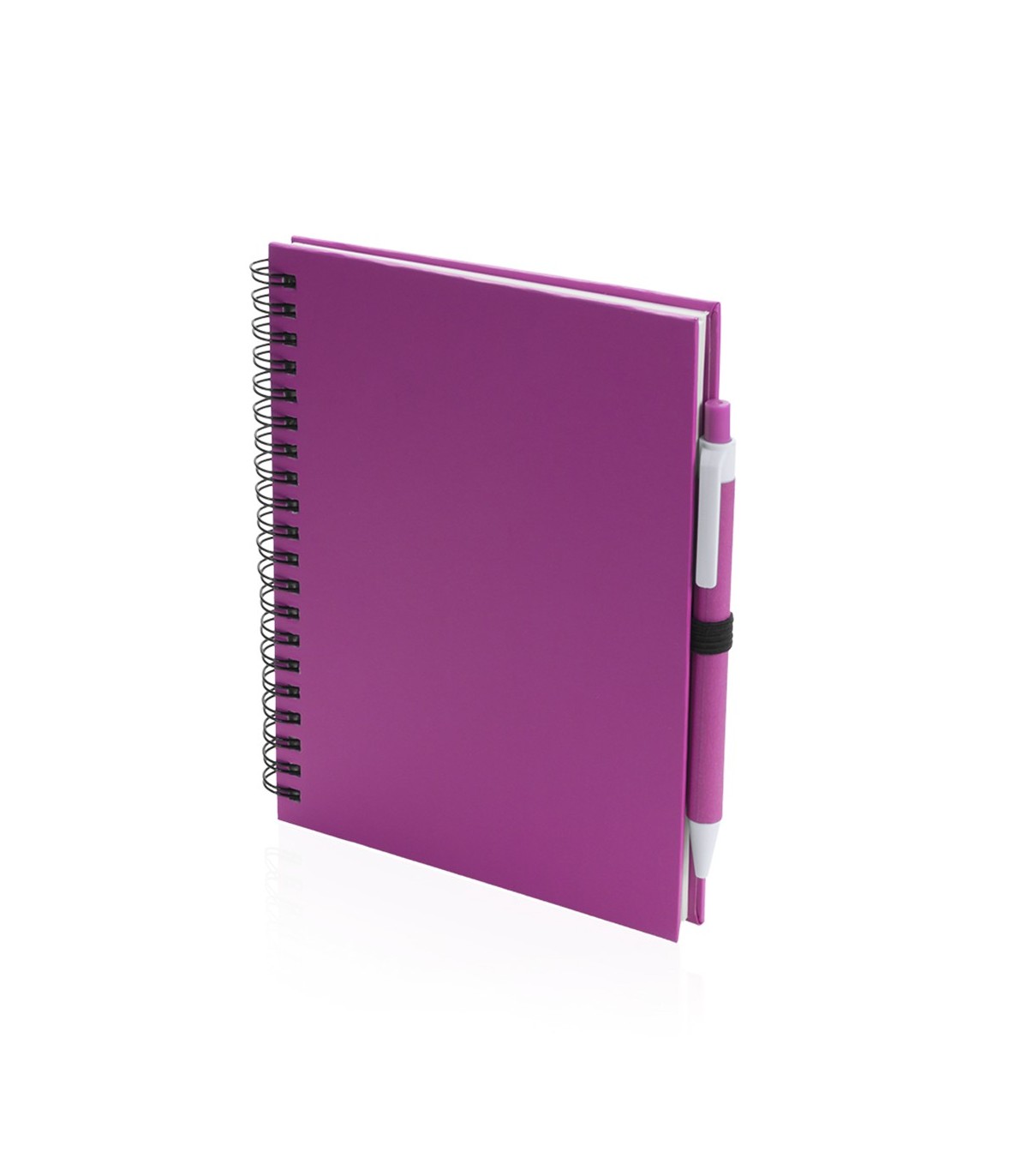 Libreta de anillas con tapas de suave tacto acabadas en resistente cartón reciclado y bolígrafo en cartón reciclado a juego. De atrevidos colores, 70 hojas lisas y con soporte para bolígrafo en contraportada.