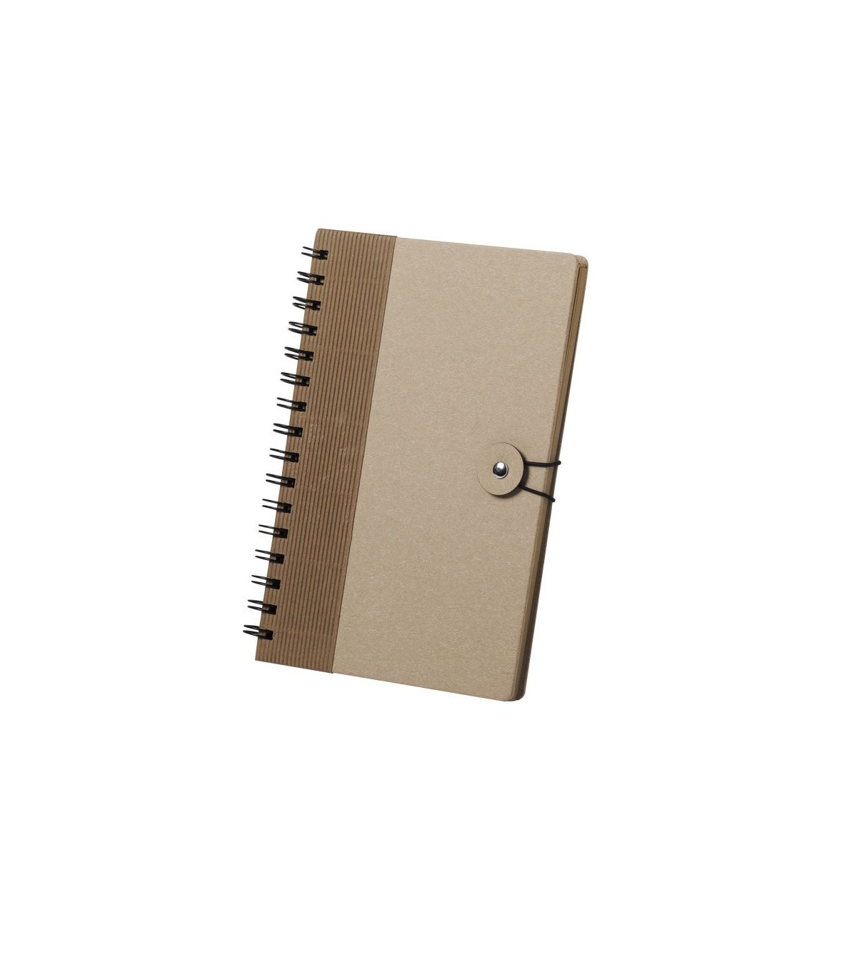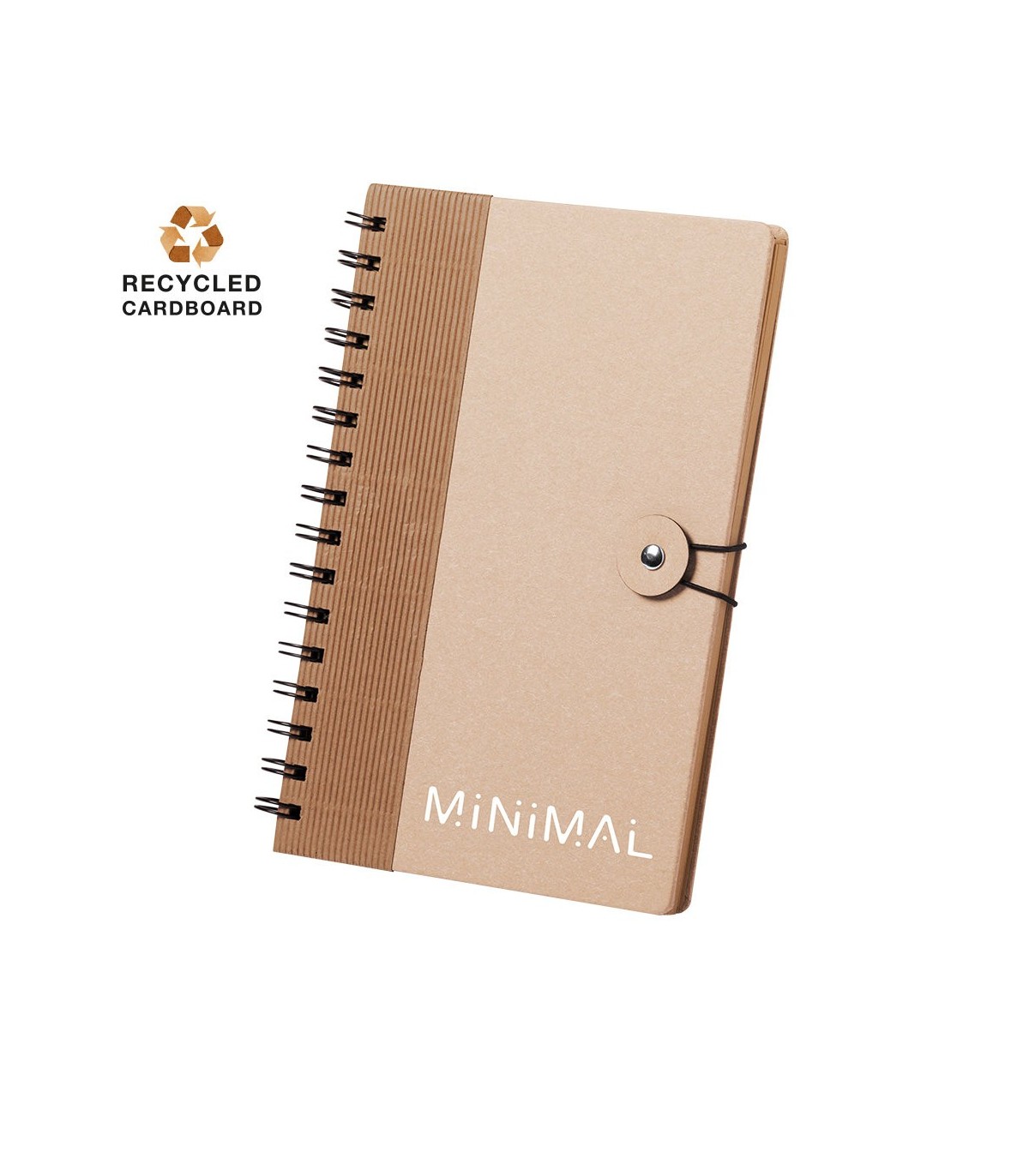 Libreta de anillas en línea nature. Con tapas rígidas de original diseño en cartón reciclado y cierre elástico. De 80 hojas con diseño eco y disposición a una raya.