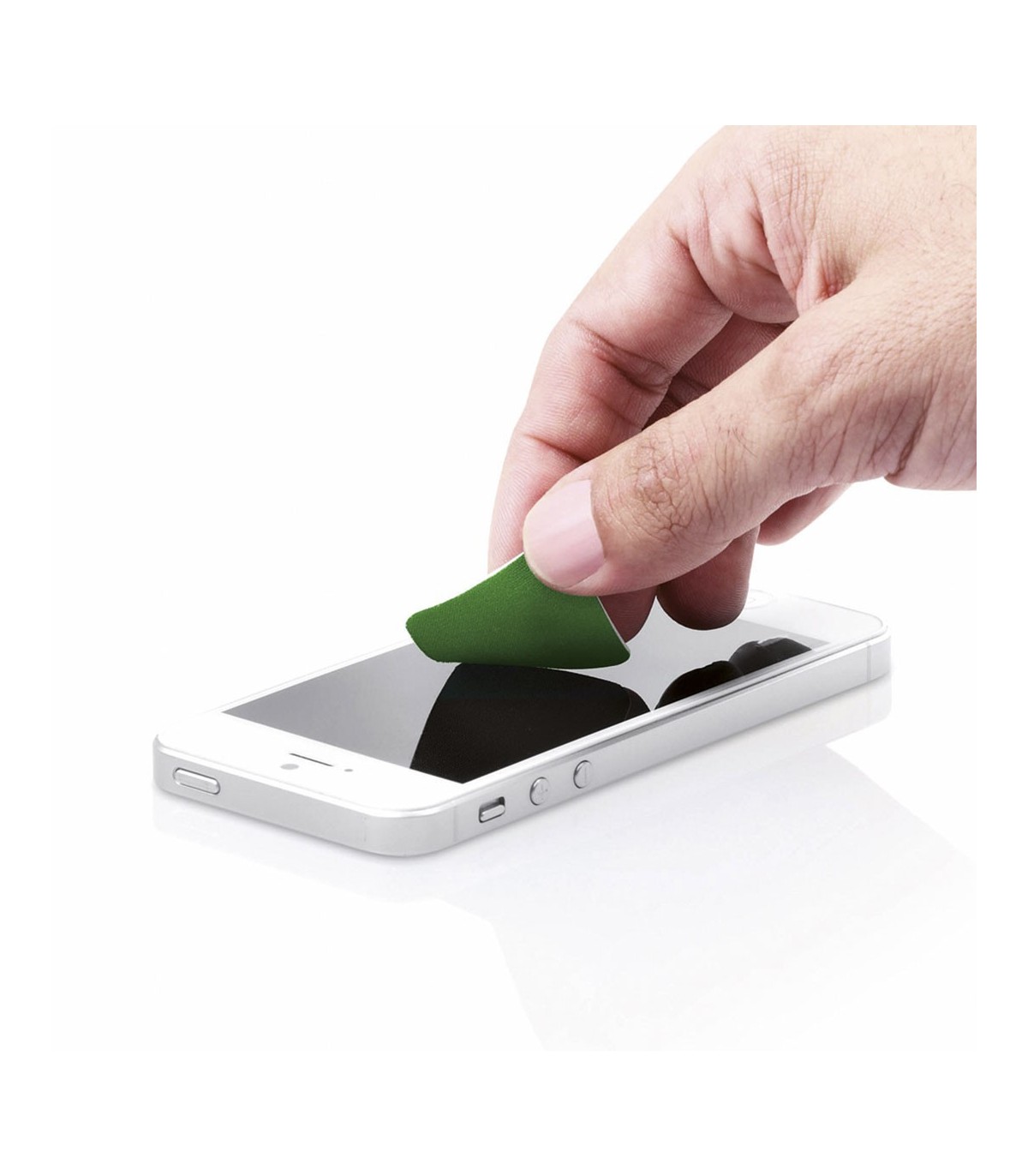 Limpiador de pantalla de suave microfibra de diseño minimalista, en desenfadados colores y con parte trasera adherente.