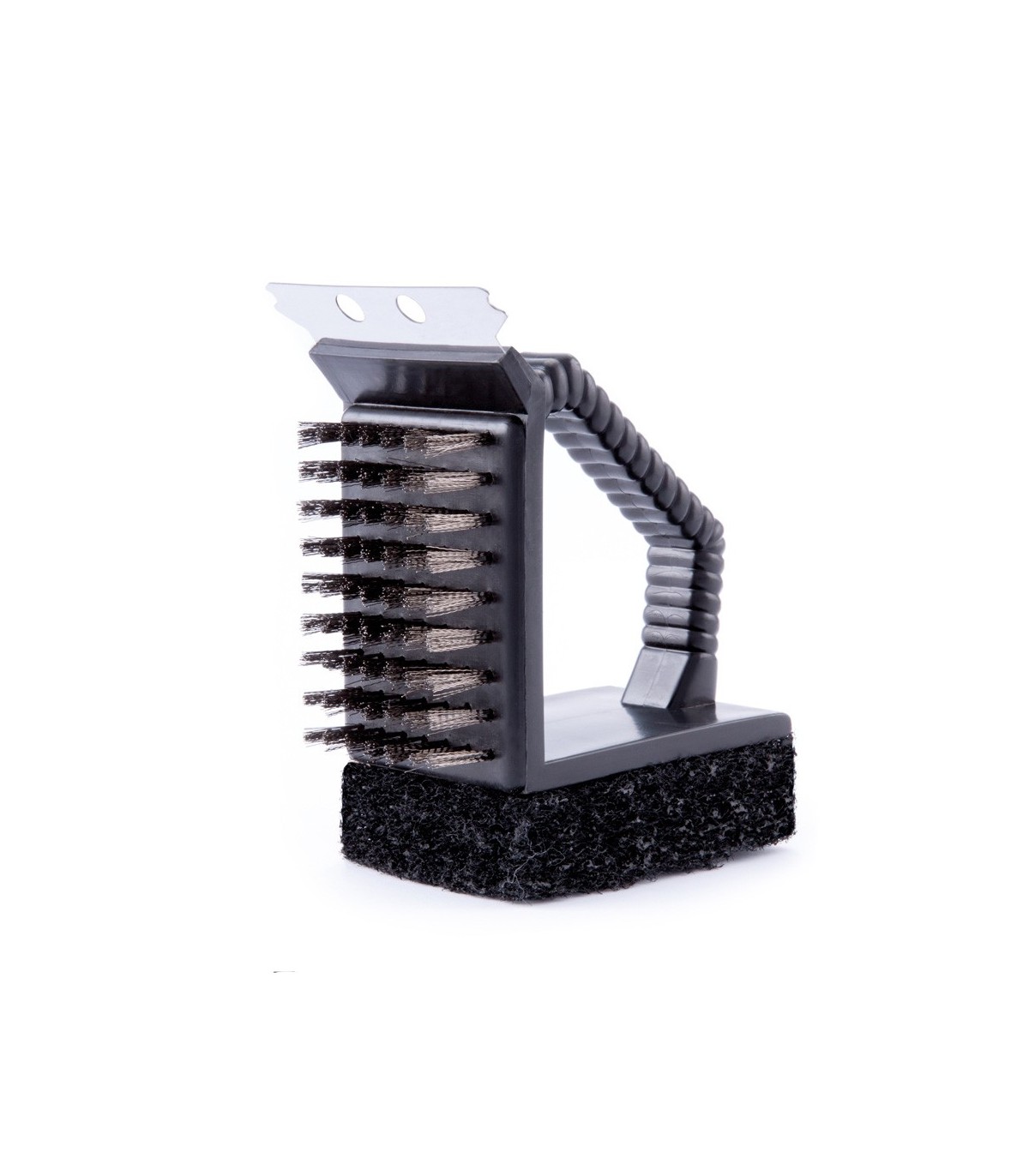Limpiador para barbacoa con cómoda asa. Con espátula de acero inox, estropajo de alta resistencia y cepillo con púas metálicas. Presentado en caja individual plateada.