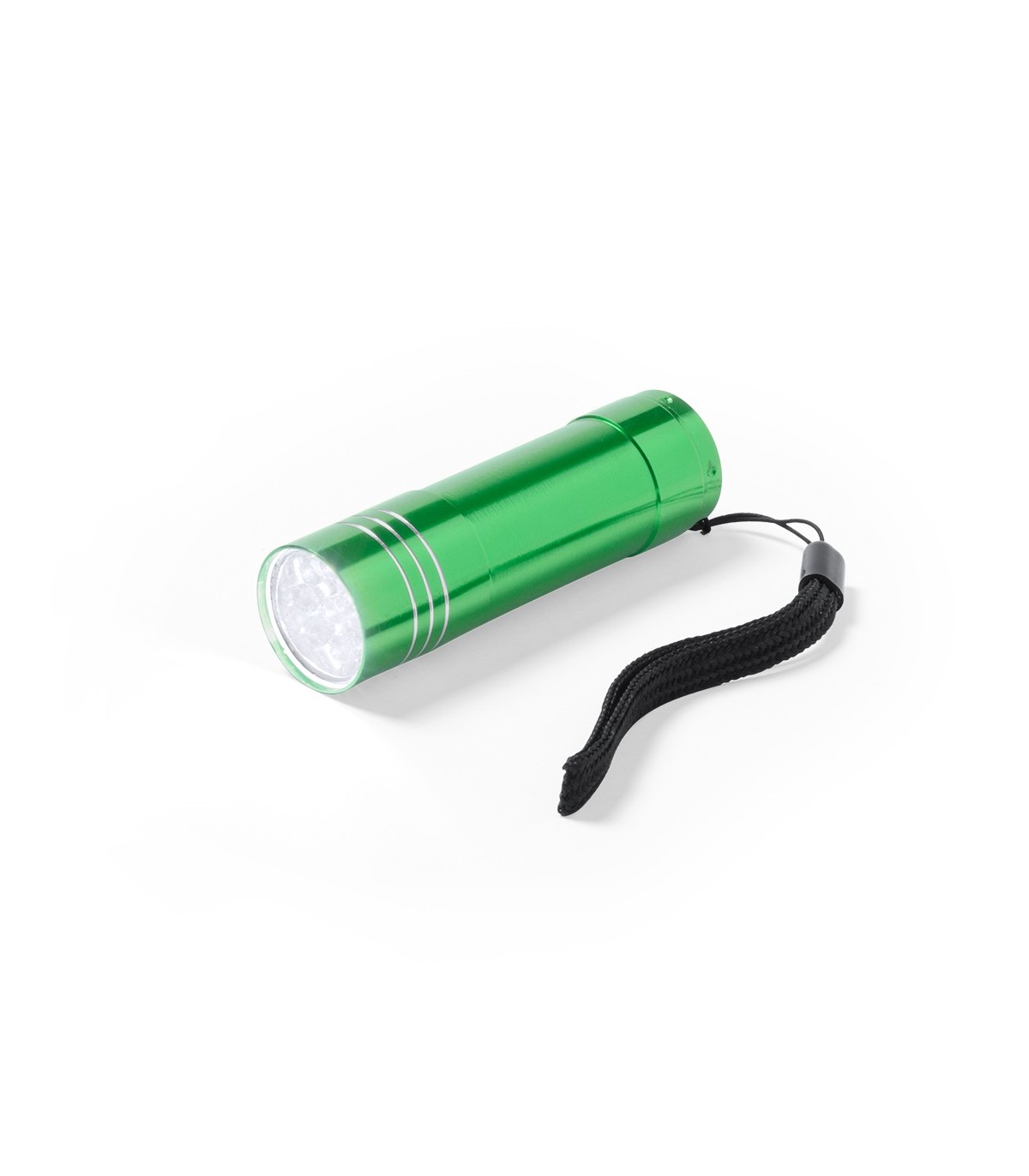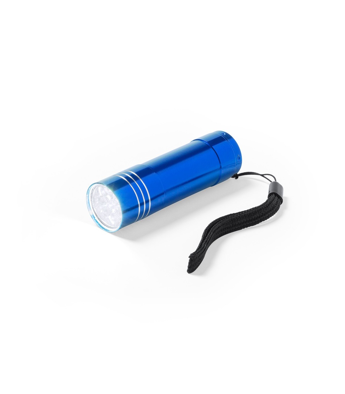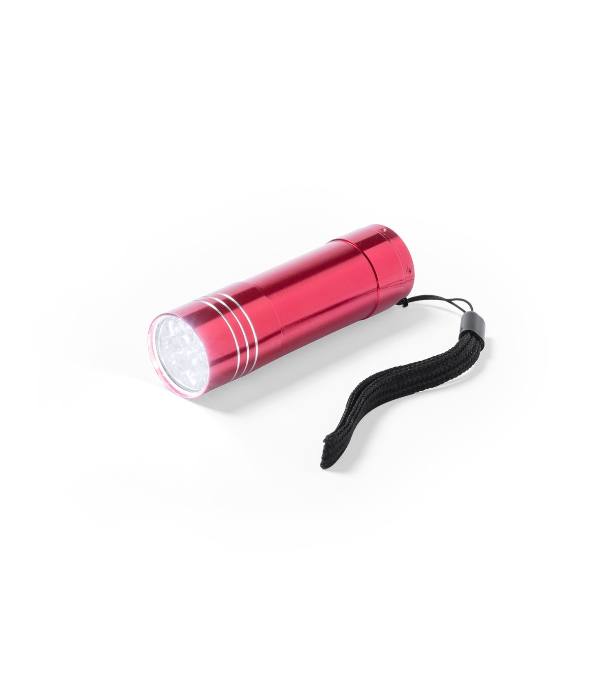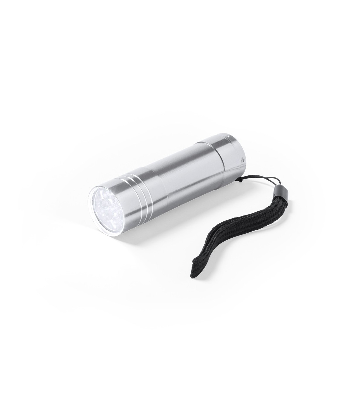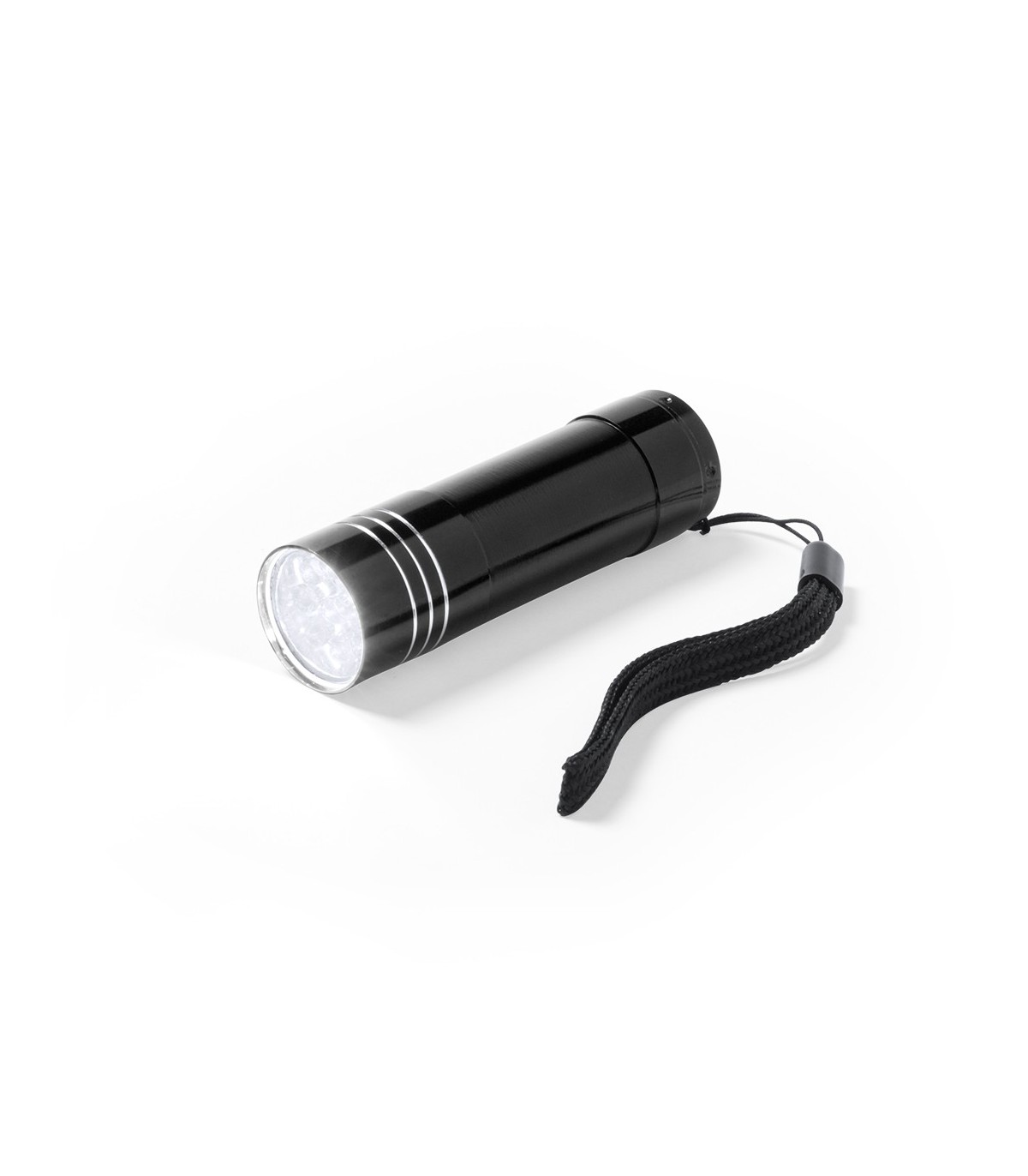 Linterna de 9 ledes cuerpo en aluminio, pulsador protegido con recubrimiento de resistente goma y cinta de transporte. Alimentación a pilas: 3xAAA no incluidas.