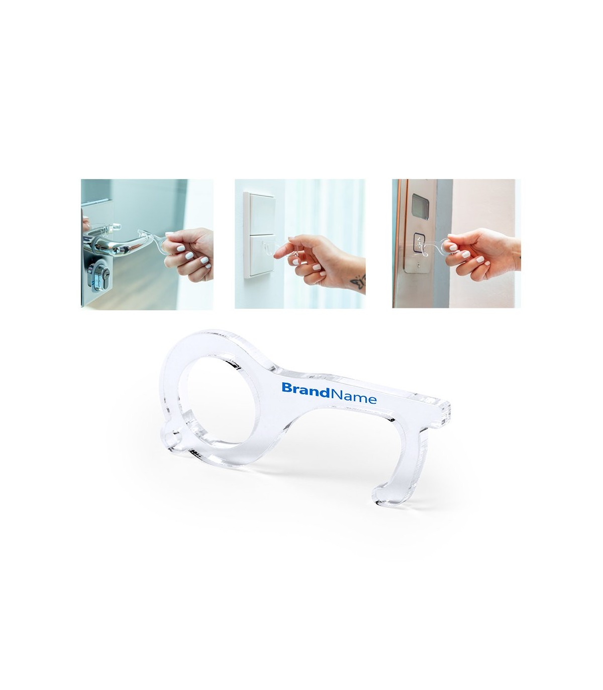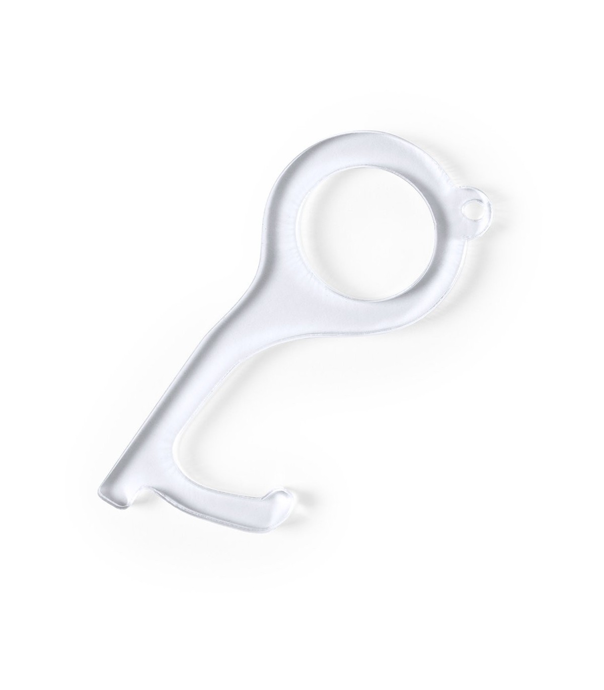 Llavero higiénico anti-contacto, fabricado en original y resistente material acrílico de acabado transparente. Especialmente diseñado para evitar tocar con las manos superficies de uso común (manivelas de puertas, interruptores, grifos de uso público, cajeros automáticos...). Con cómodo troquel para el dedo y presentado en bolsa individual de diseño. Recomendado para marcaje en tampografía.