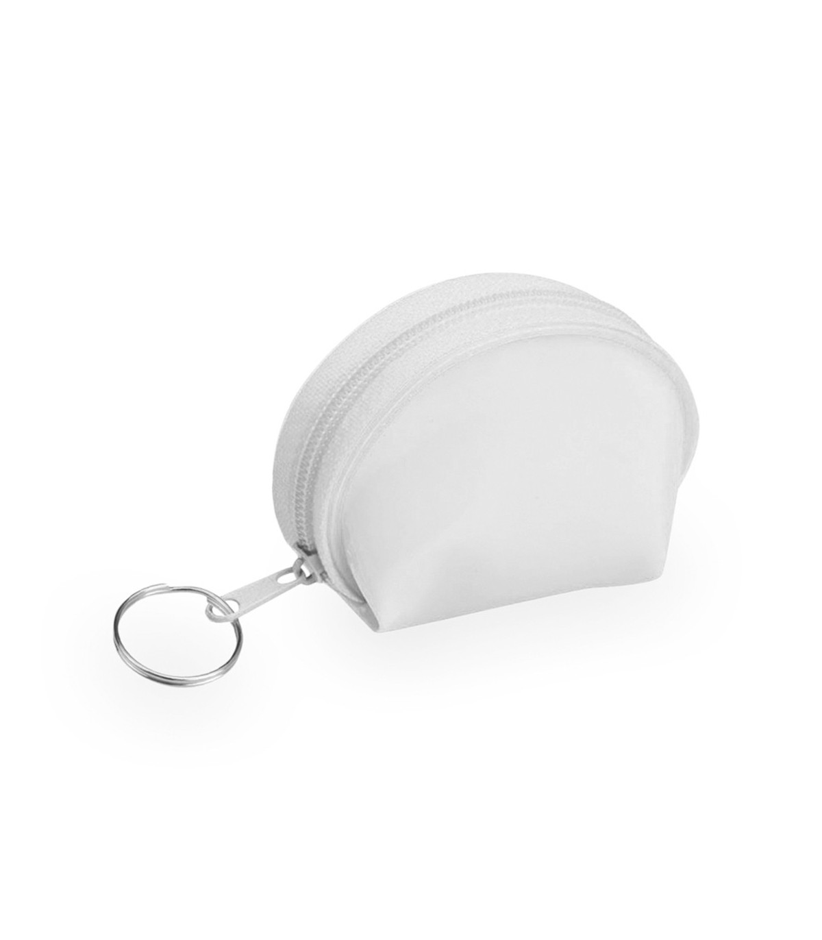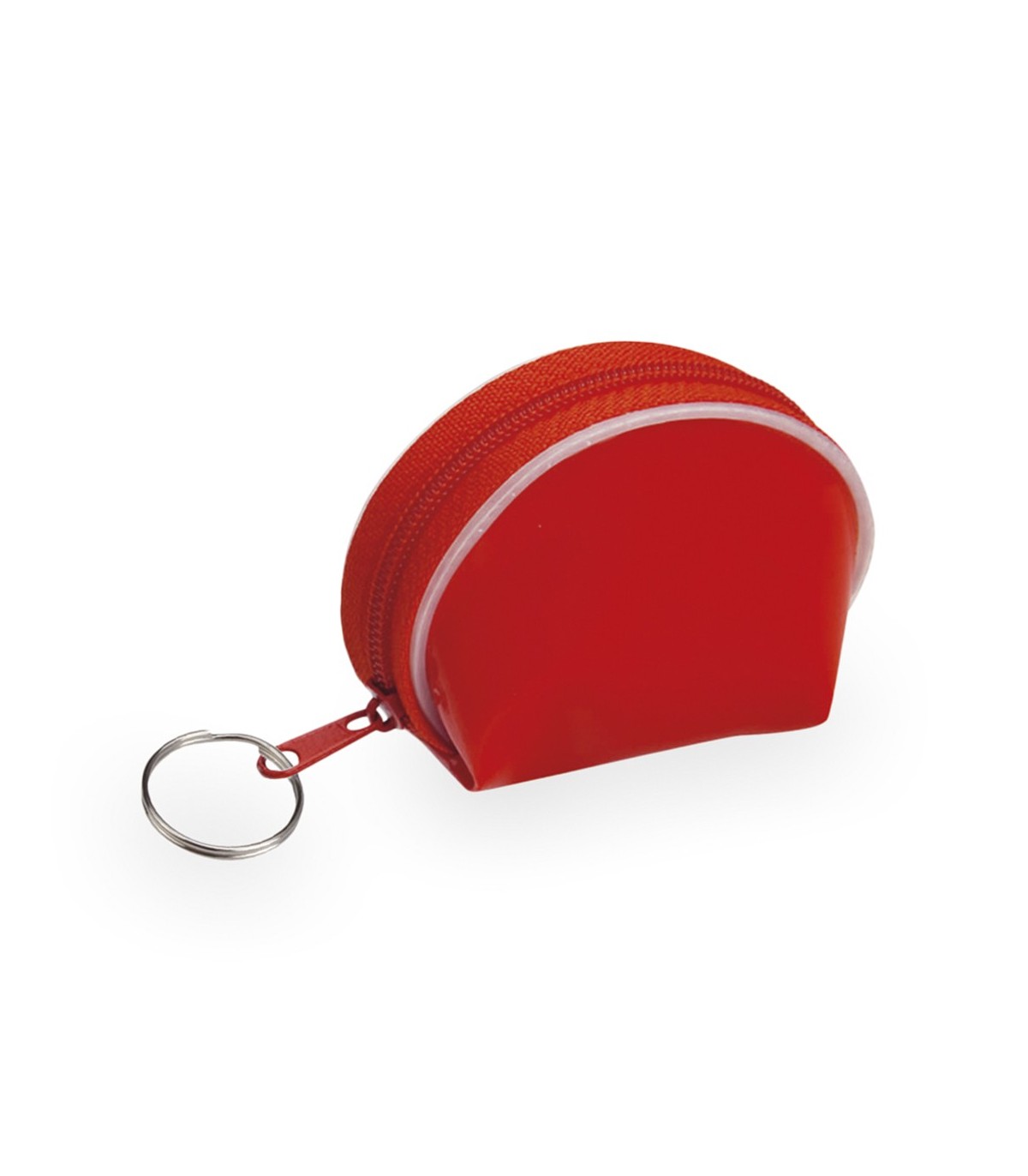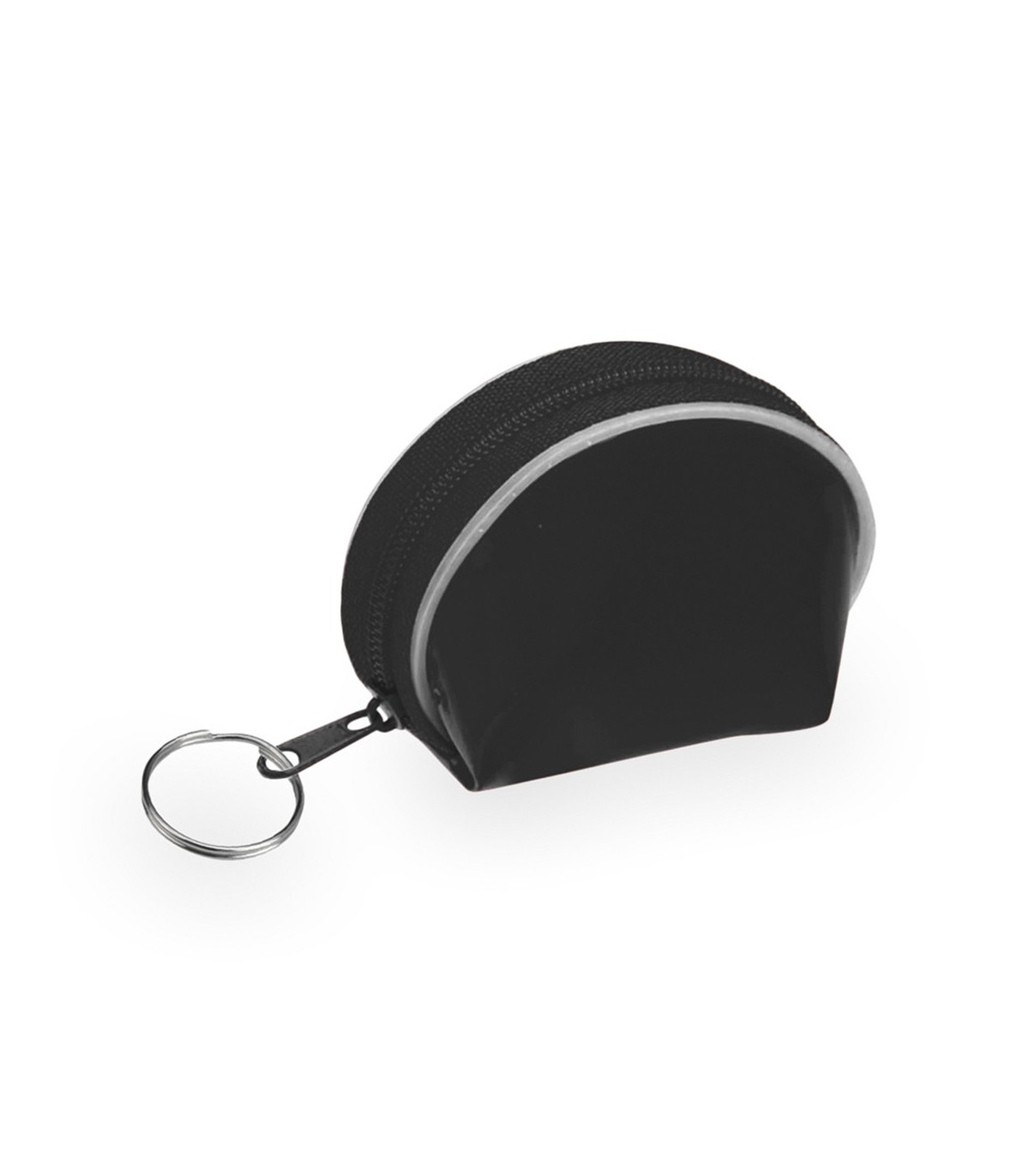 Llavero monedero de diseño semicircular en material 100% PVC de variados y originales colores para imprimir. Con cierre de cremallera a juego, ribete en color plateado y anilla en tirador.