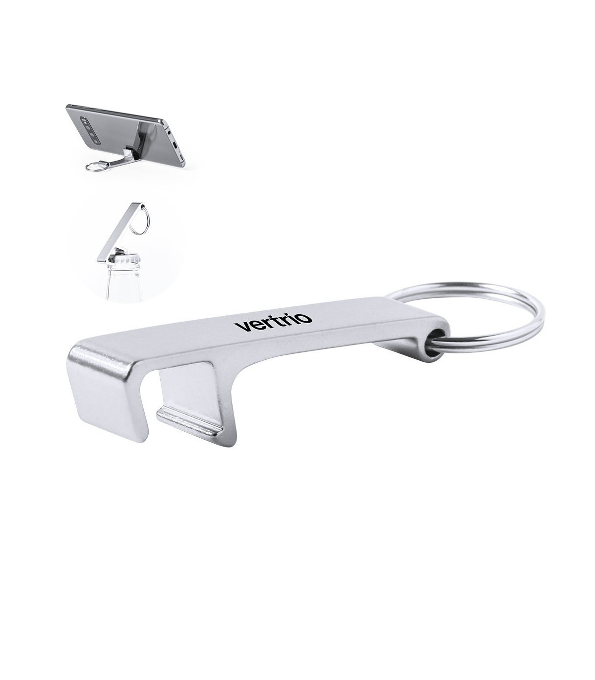 Llaveros con soporte para smartphone y tablet fabricado en aluminio de acabado mate, personalizados con tu logo para regalos de empresa.