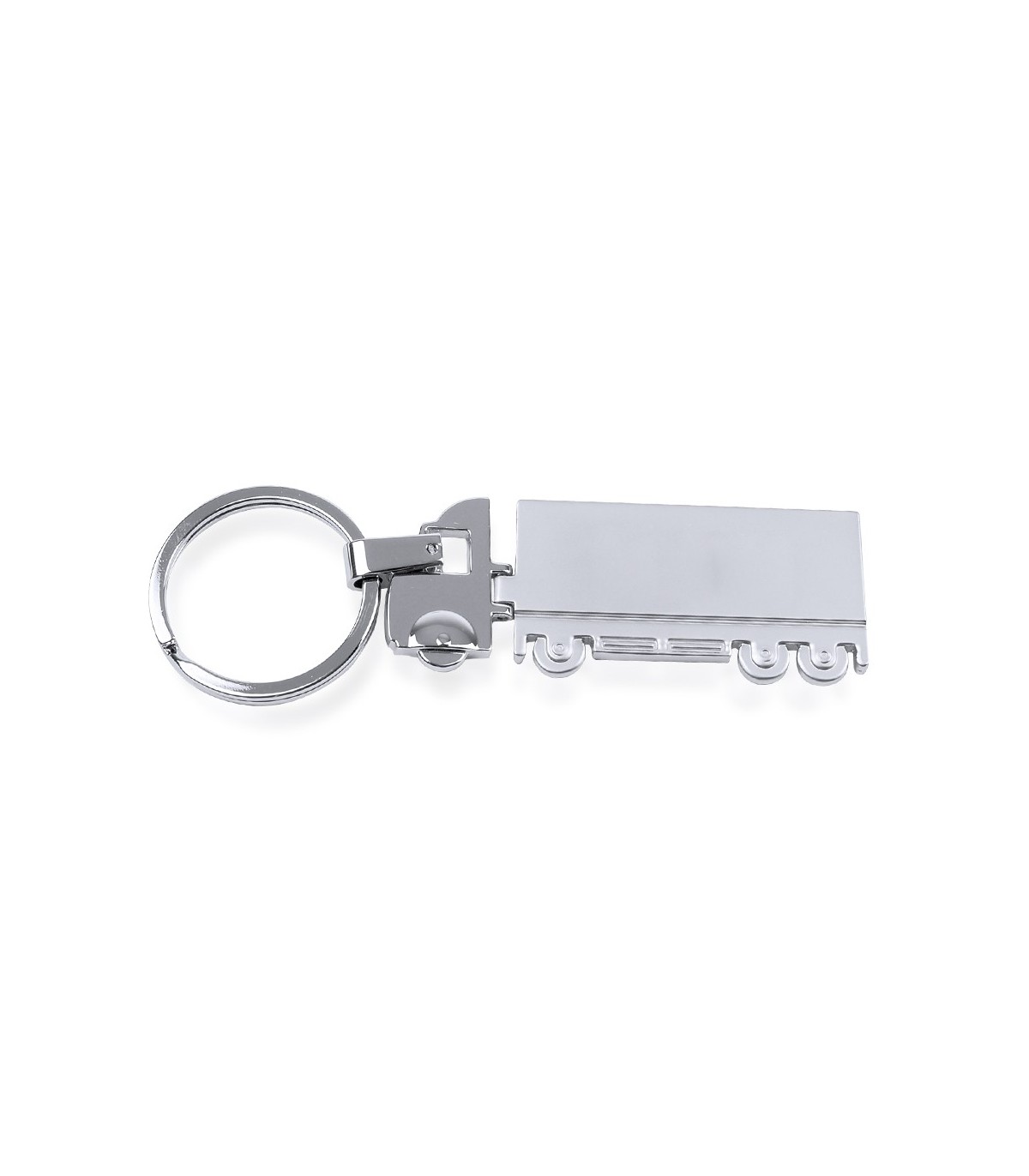 Llavero metálico en divertido diseño de camión especialmente diseñado para marcaje en láser. Con cabina en acabado brillo y remolque en acabado mate.