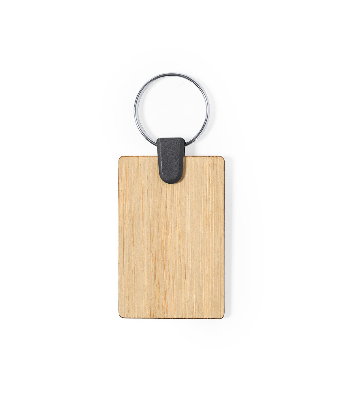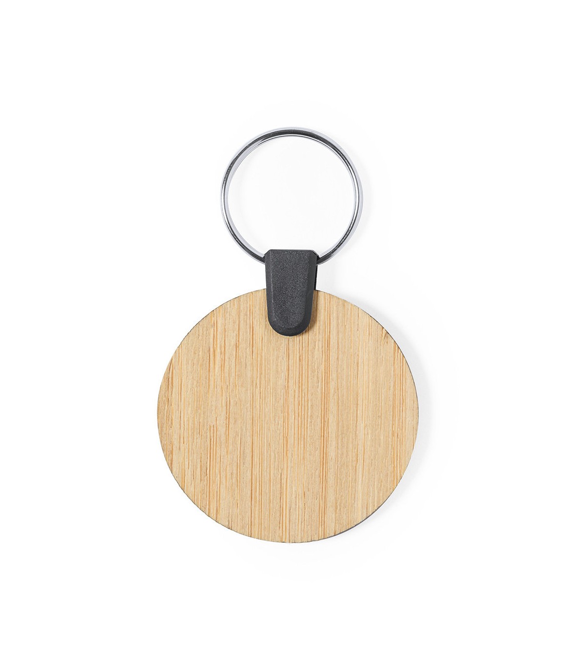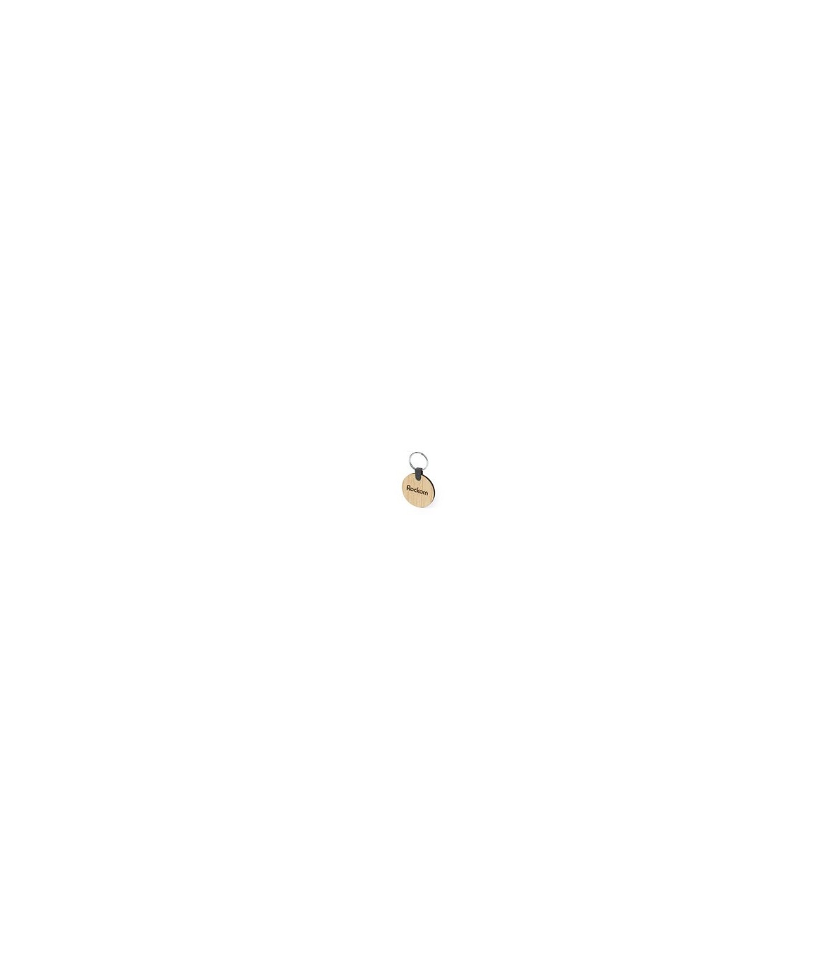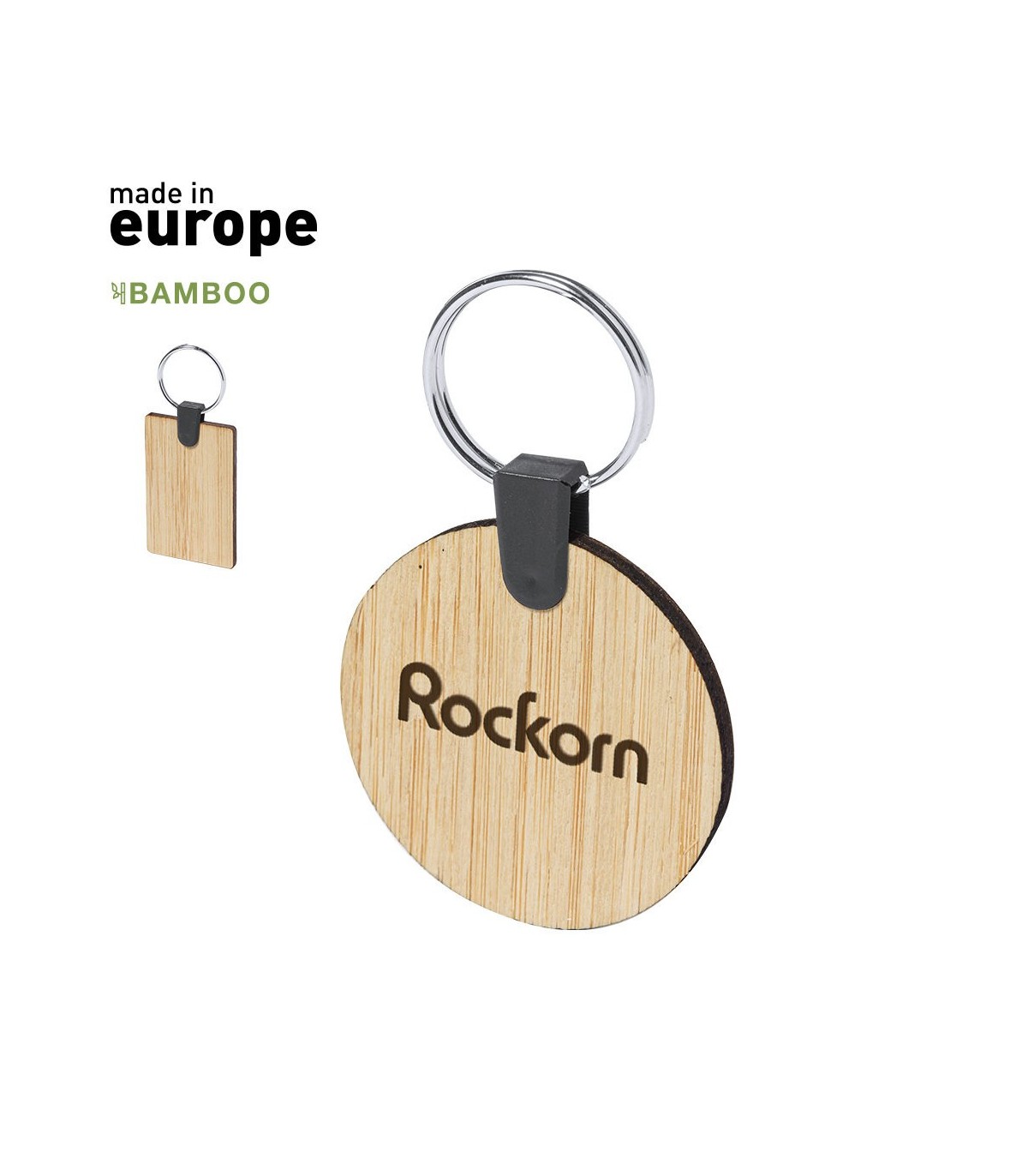 Llavero de fabricación ecológica, hecho en bambú procedente de cortes naturales. De fabricación europea y disponible en diseños circular y rectangular.