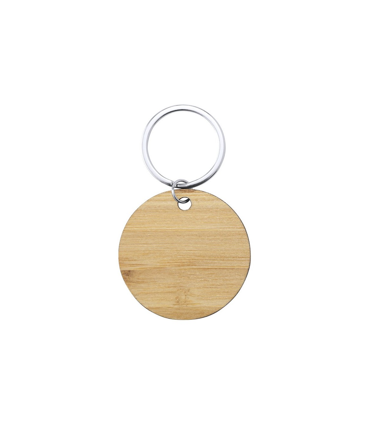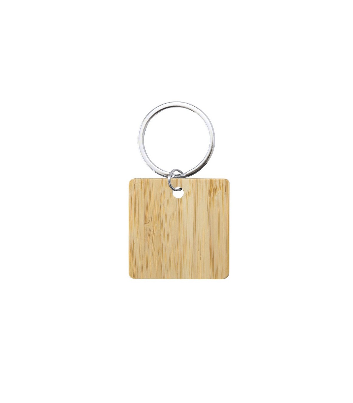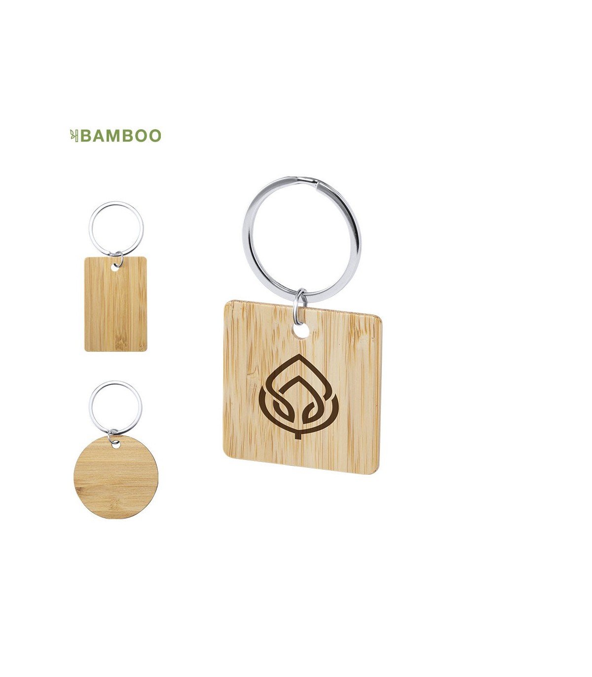 Llavero de fabricación ecológica fabricado en bambú, disponible en diseños circular, cuadrado y rectangular.