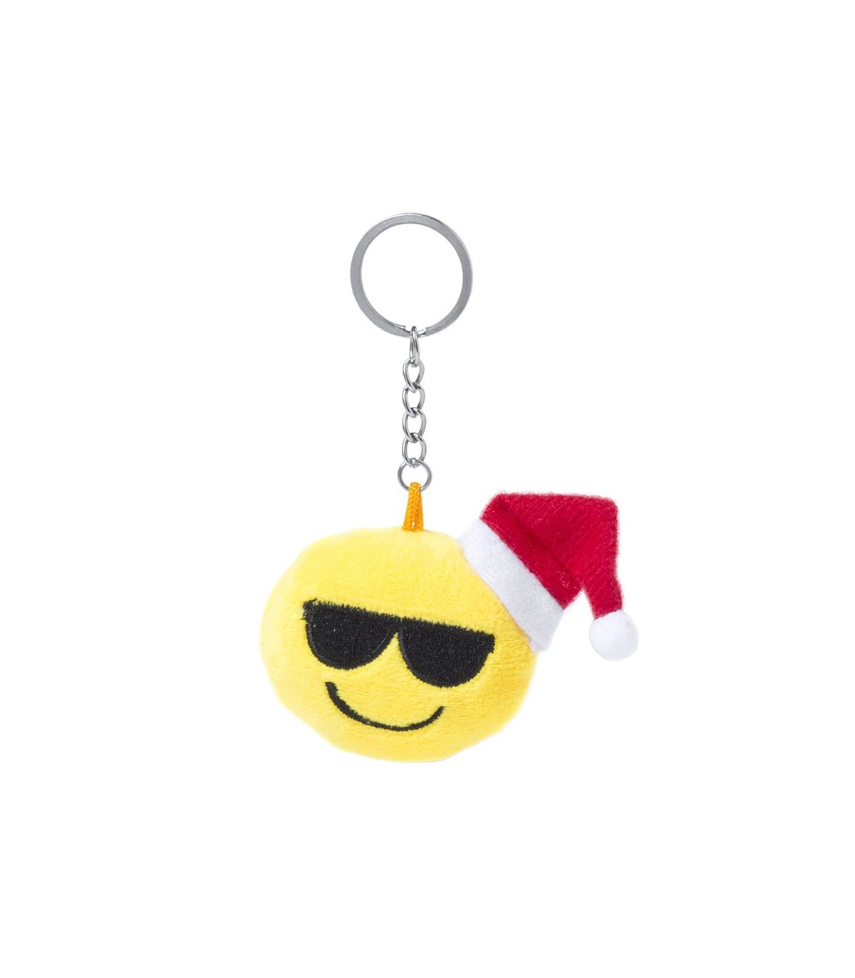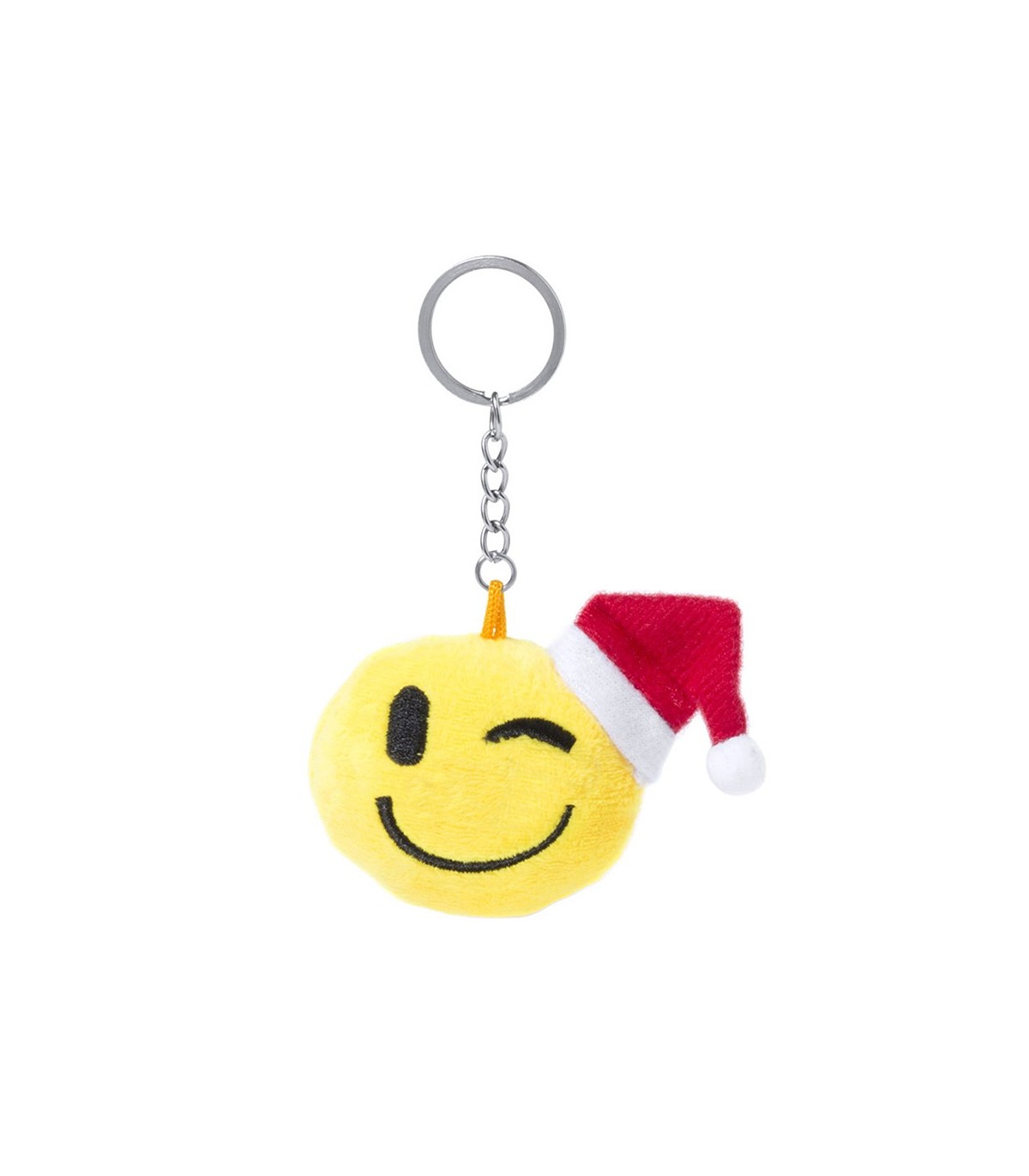 Divertidos llaveros emoji de peluche con gorro de navidad y caritas de gafas y guiño idóneos para regalos promocionales de empresa como artículos publicitarios.