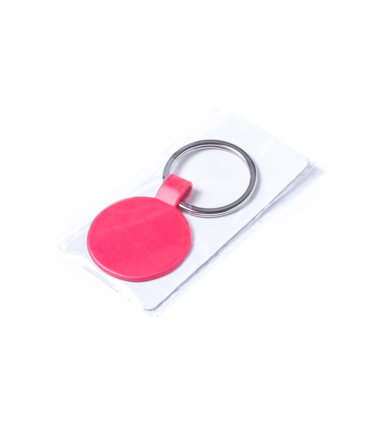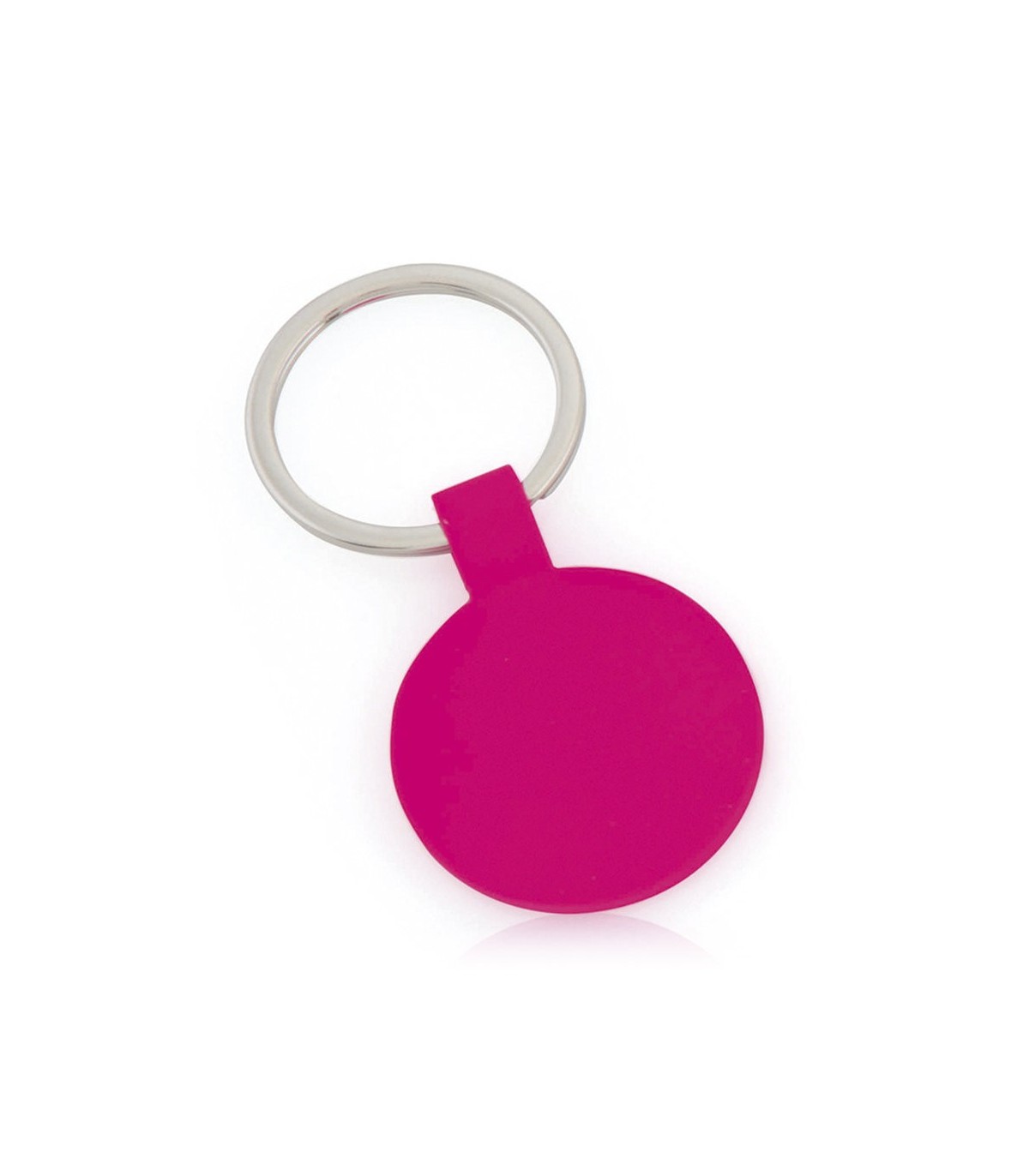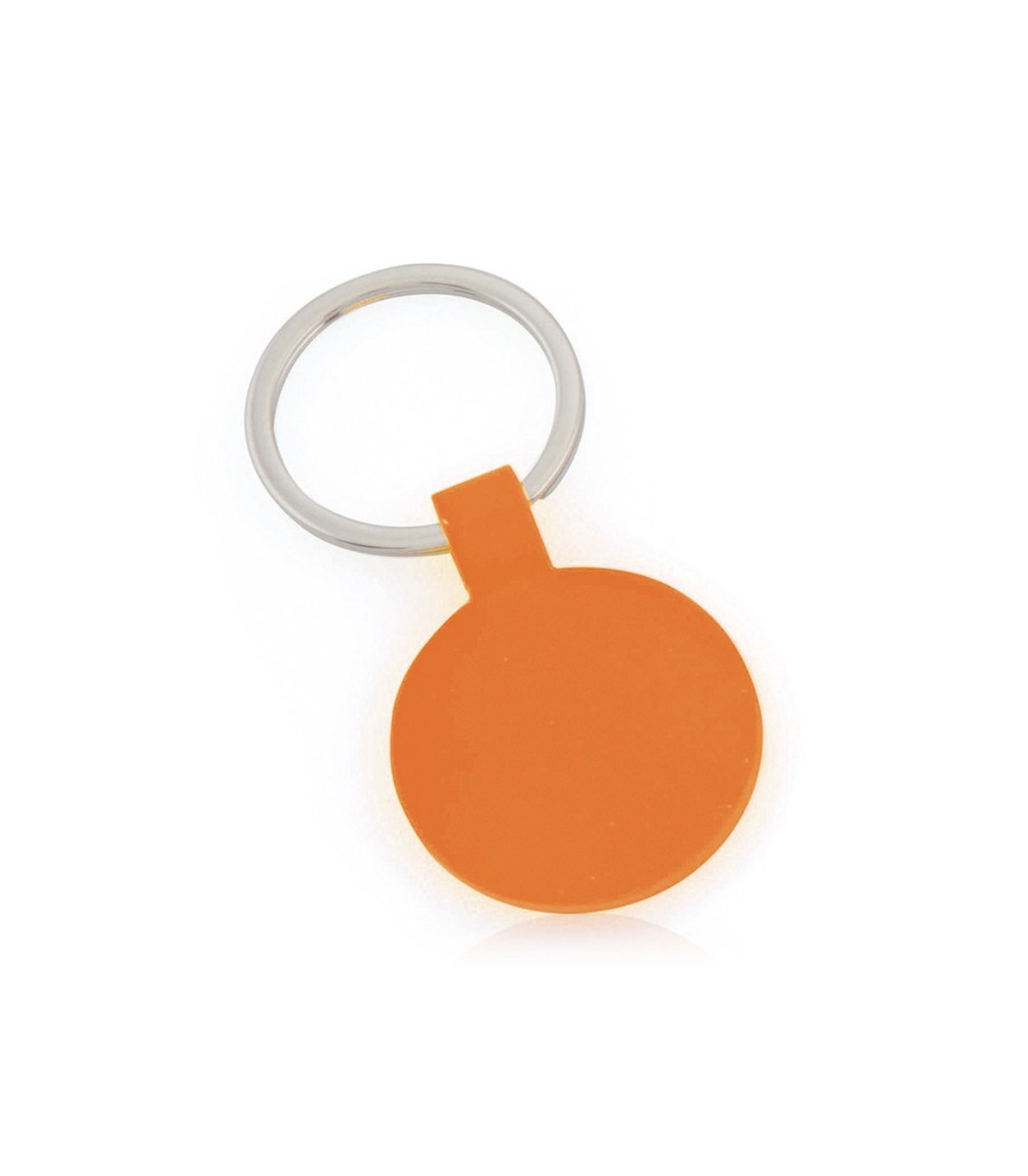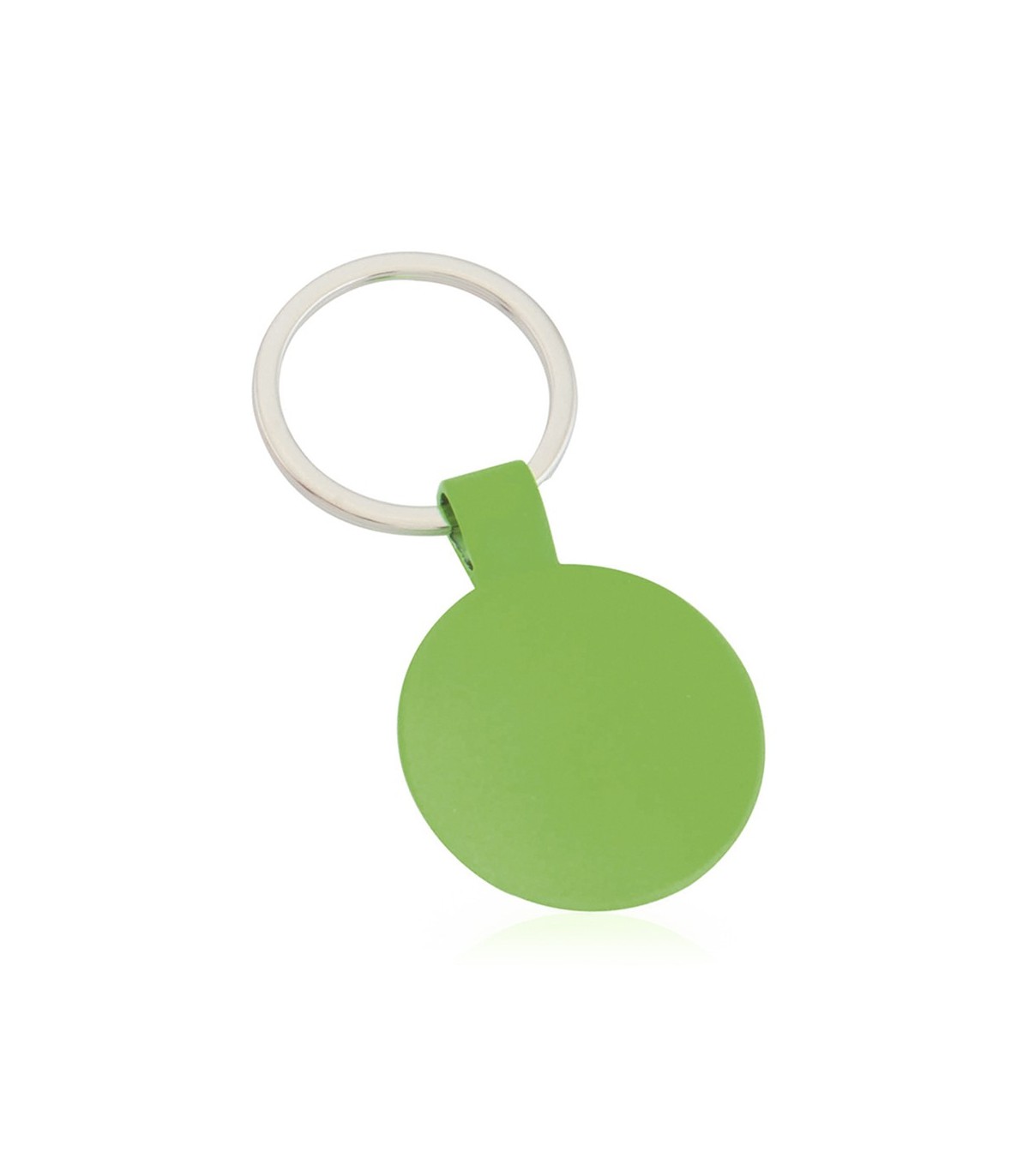 Llaveros fluorescentes circules tipo chapa, delgados y metálicos para regalos de empresa personalizados como artículos de propaganda con logo.