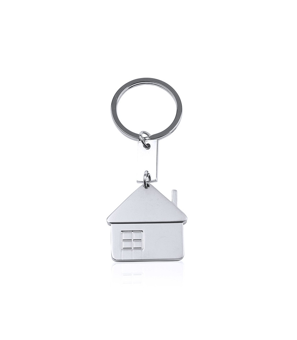 Llaveros originales figura casa metálico con acabado mate y troquelado con ventana, para regalos de empresa publicitarios de inmobiliarias.