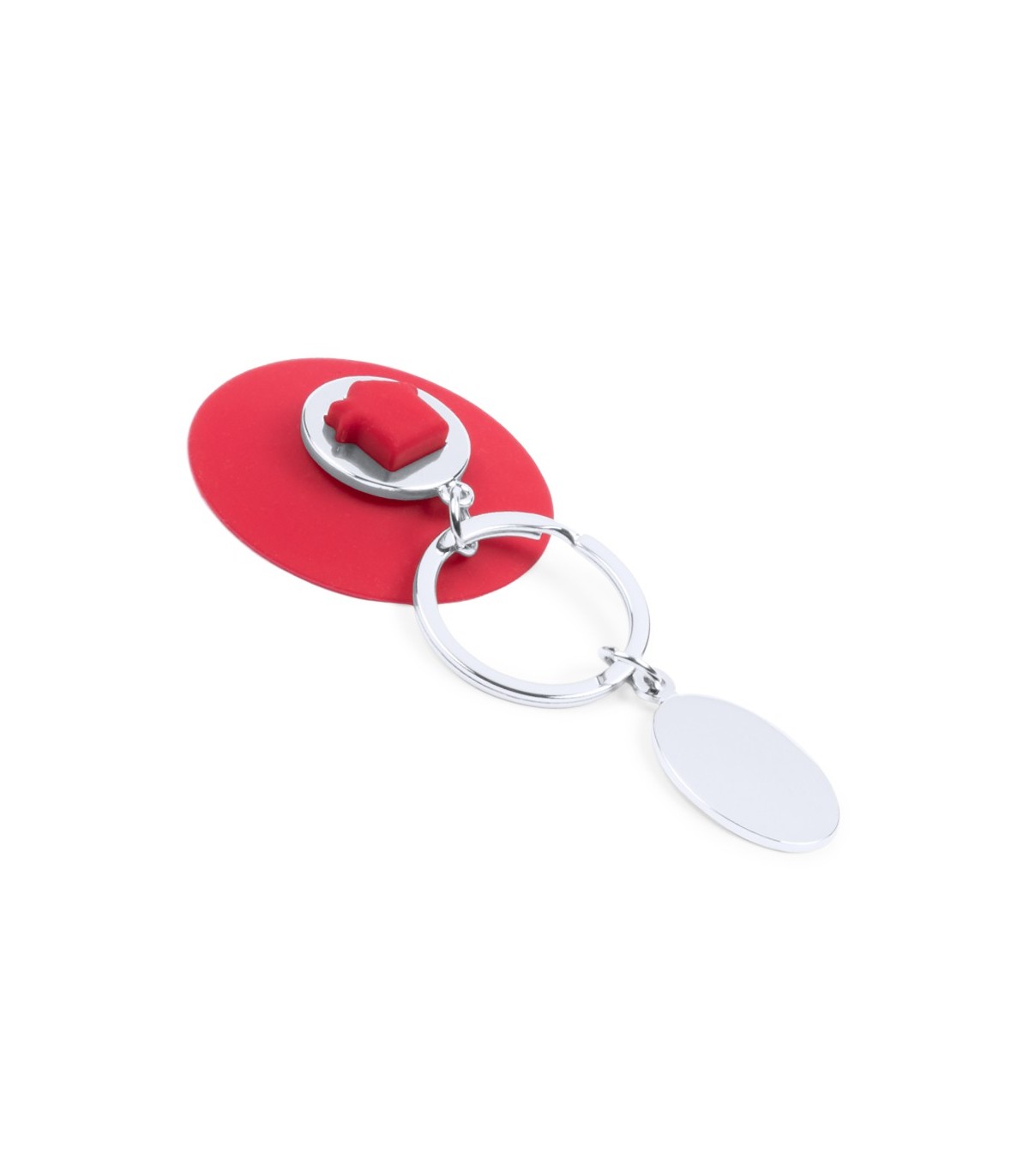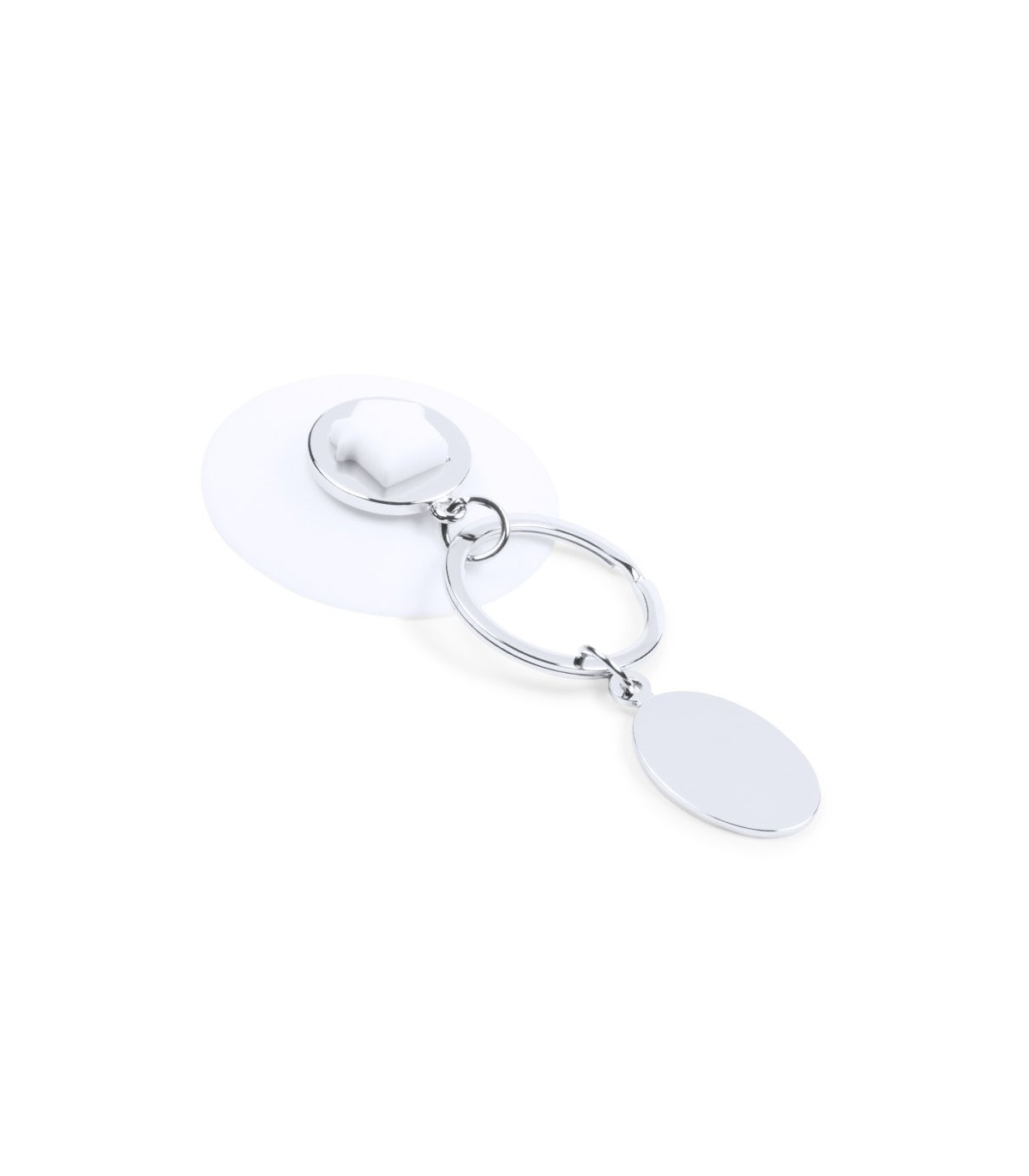 Llaveros con chapa metálica y ventosa de silicona extraíble para colocar en diferentes superficies colgados personalizados como detalles publicitarios.