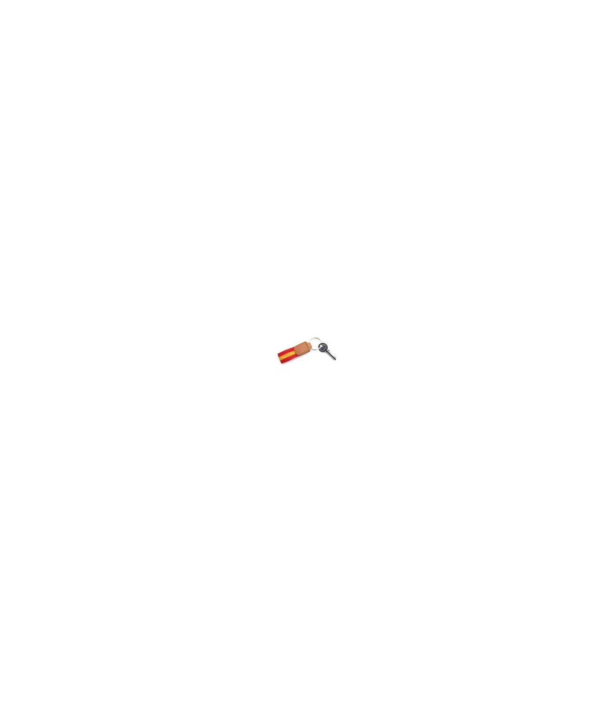 Llavero de poliéster con accesorios de bandera española en la cinta y refuerzo en polipiel de color marrón.