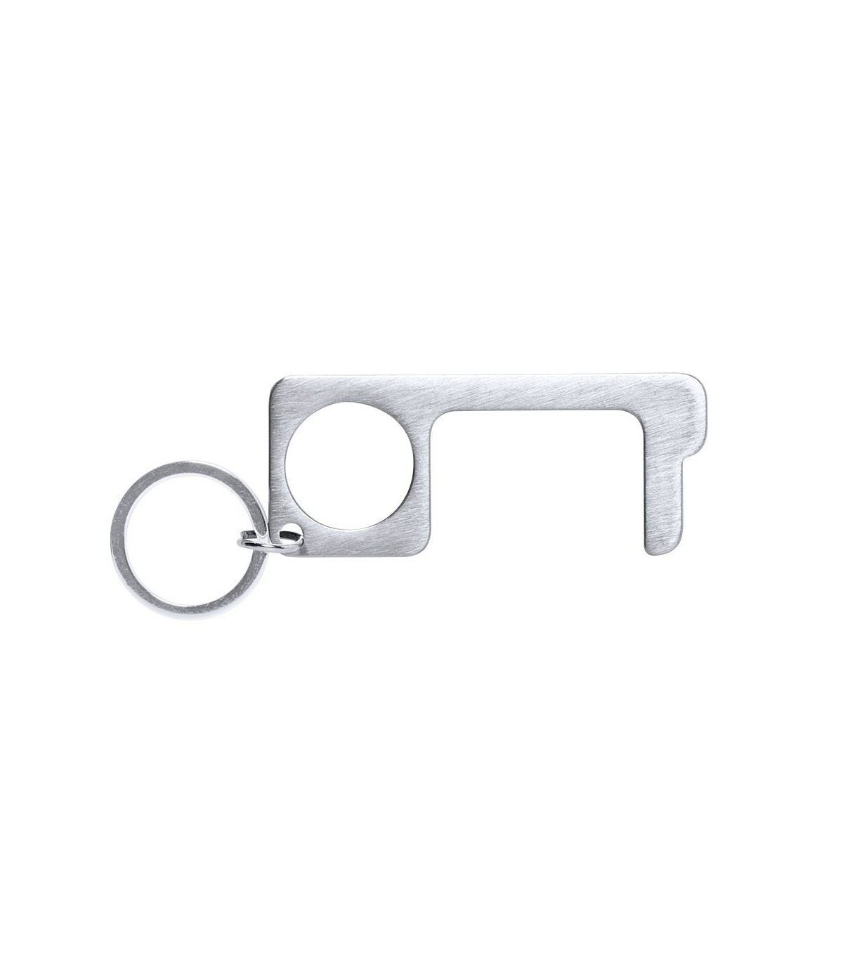 Llavero higiénico anti-contacto, fabricado en resistente acero inox. Especialmente diseñado para evitar tocar con las manos superficies de uso común (manivelas de puertas, interruptores, grifos de uso público, cajeros automáticos...). Con cómodo troquel para el dedo y presentado en bolsita individual. Recomendado para marcaje en láser.