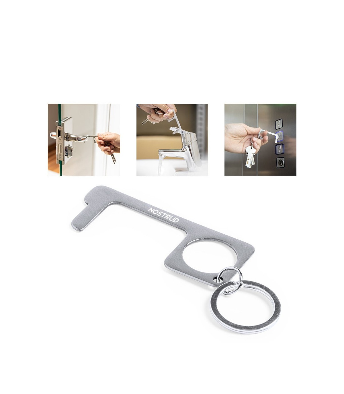 Llavero anti-contacto para evitar tocar con las manos superficies de uso común (manivelas de puertas, interruptores, grifos de uso público, cajeros automáticos...).