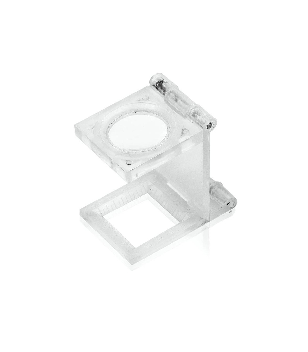 Lupa plegable cuentahilos de 8 aumentos. Con regla de medición integrada en cuerpo y presentada en caja individual.