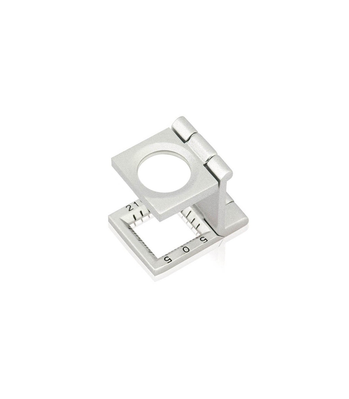 Lupa cuentahilos metálica y plegable de 10 aumentos. Con lente de cristal, regla de medición integrada en cuerpo y presentada en caja individual.