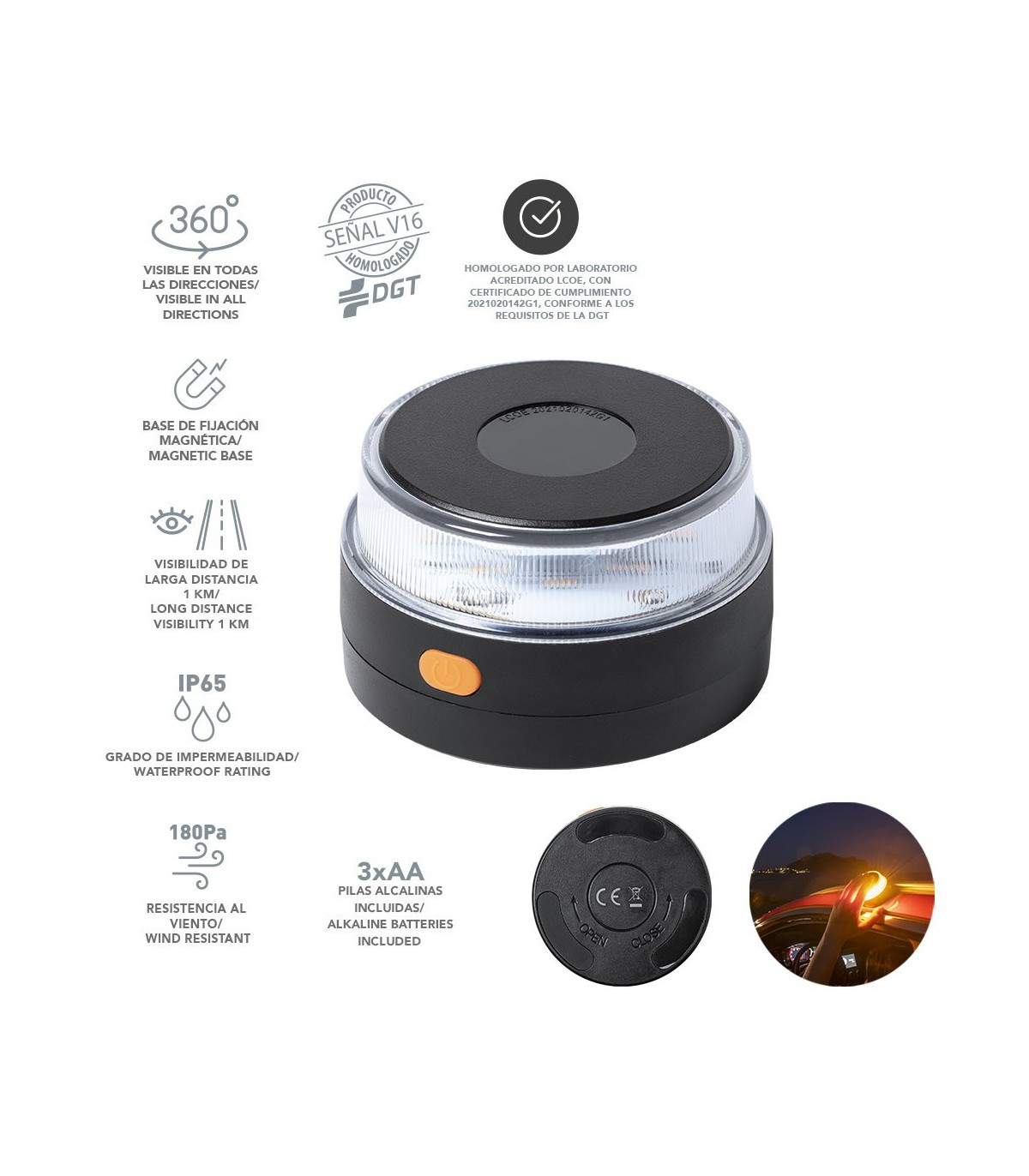Luz de emergencia homologada V16 para vehículos. Fabricada conforme a la normativa de seguridad vigente y homologada por laboratorio acreditado LCOE, según requisitos de la DGT , con número de homologación marcado en la parte superior del artículo. De activación manual y con base de fijación magnética. Resistencia al viento de hasta 180Pa, visibilidad 360° -hasta 1 km de distancia- y resistencia al agua conforme a estándares IP65. De tamaño compacto para guardar en cualquier compartimento del vehículo y tenerla a mano en caso de emergencia. Presentada en caja individual de diseño. Manual incluido (español e inglés). Alimentación a pilas (3xAA pilas alcalinas incluidas). Banda lateral lisa para impresión. Certificado de Cumplimiento 2021020142G1 emitido por LCOE, conforme a los requisitos de la DGT.