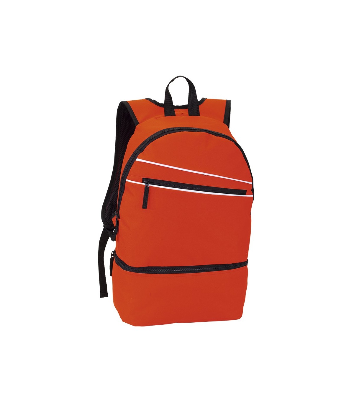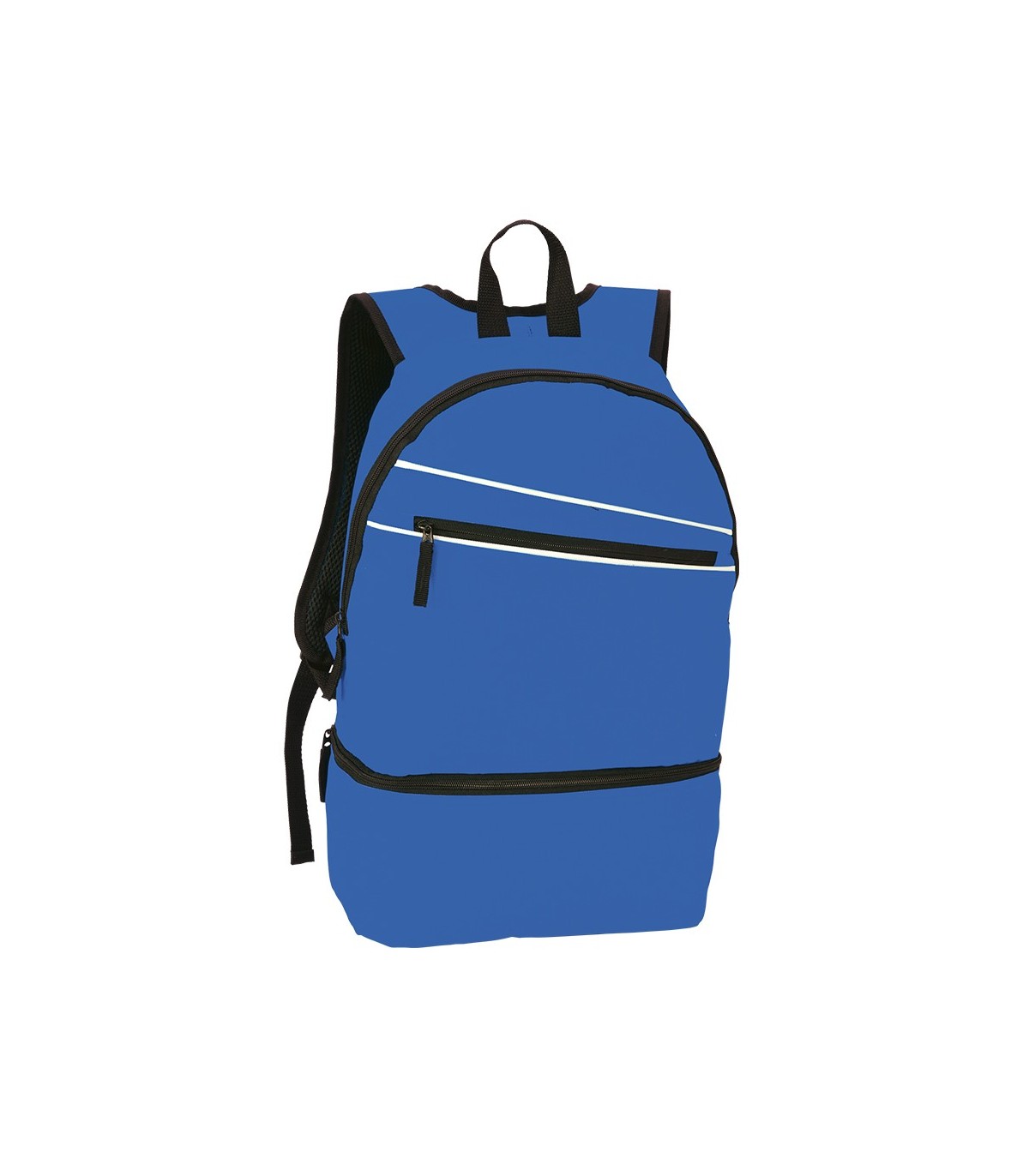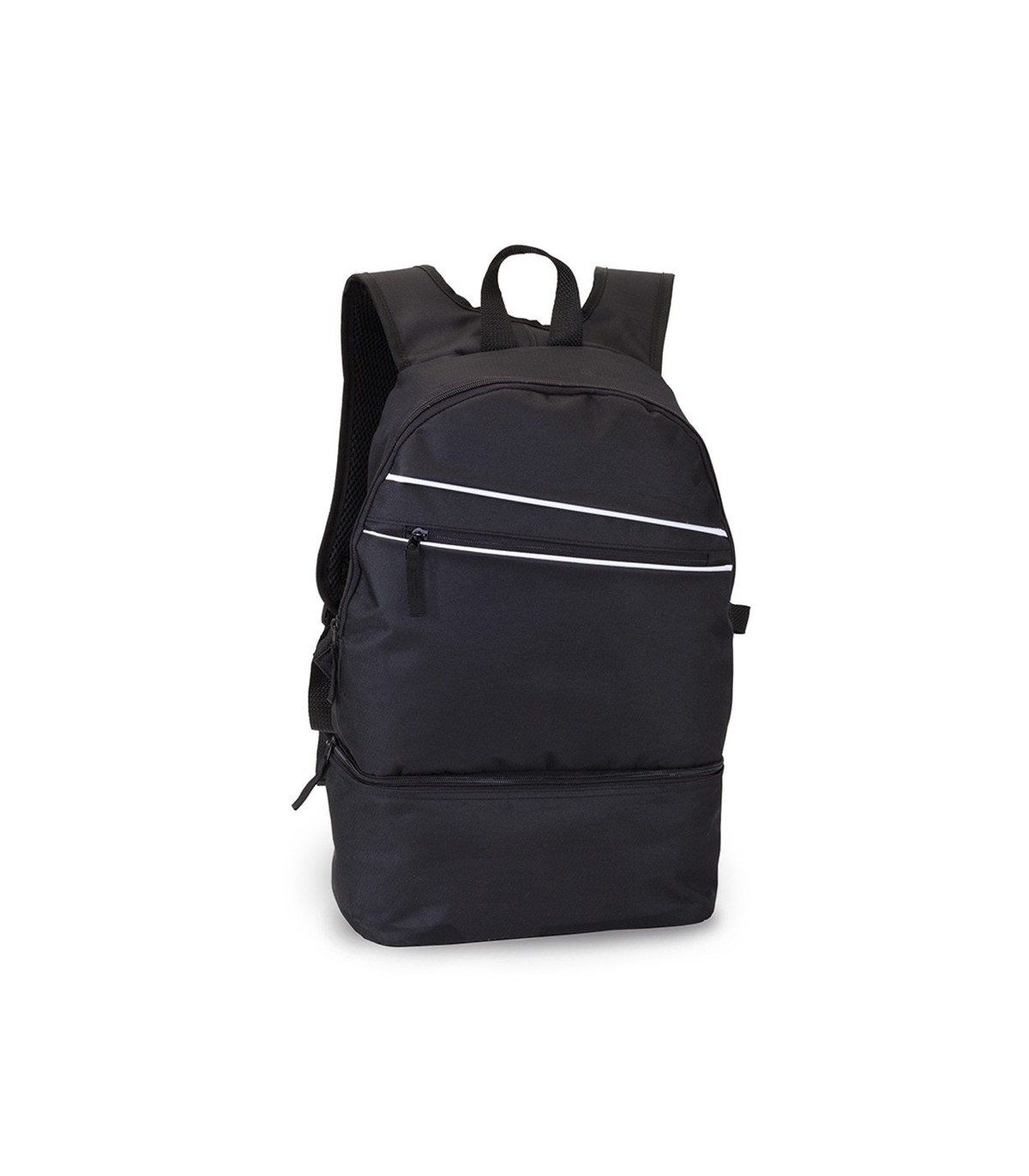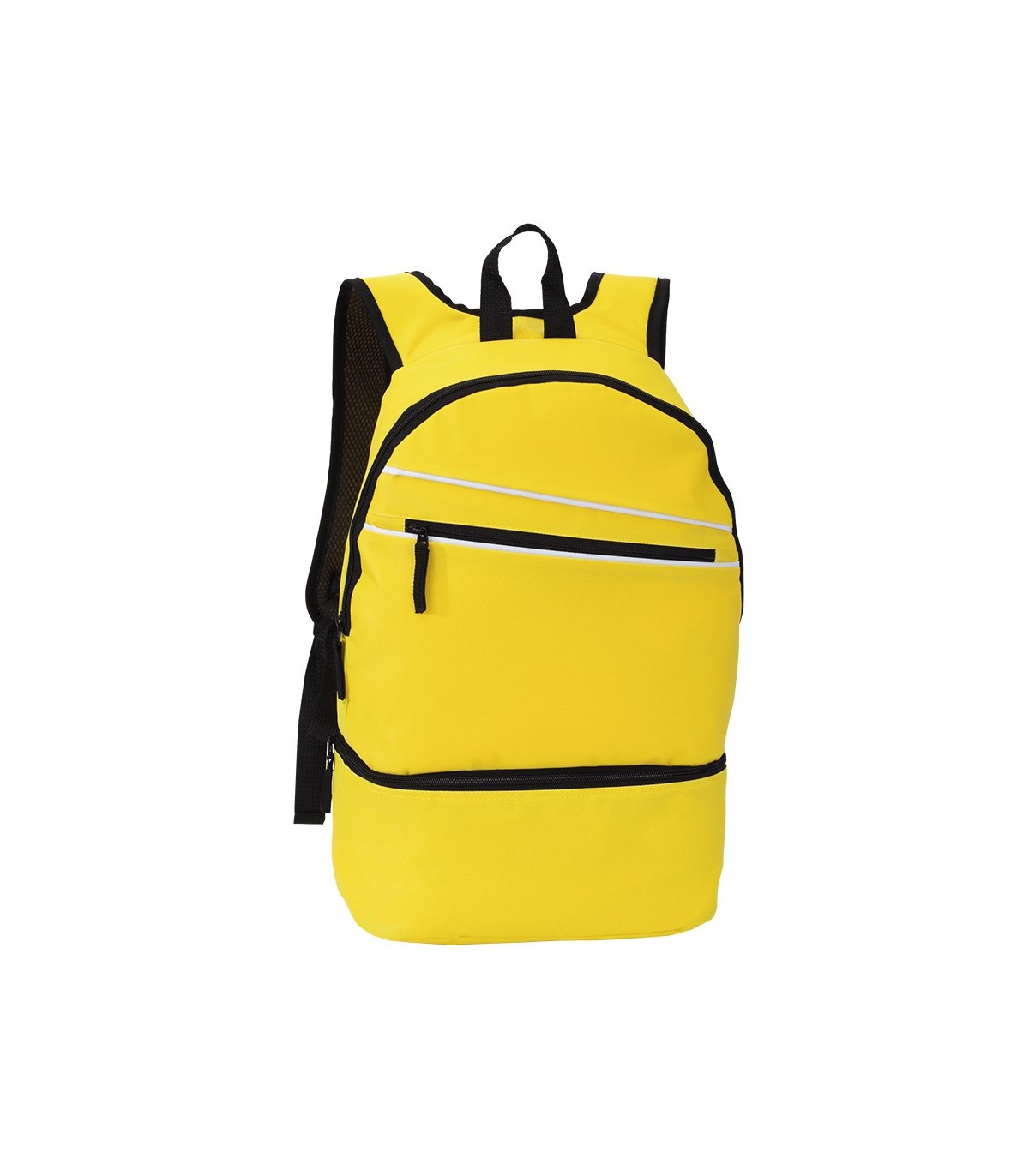 Mochila en resistente poliéster 600D de desenfadado diseño en variada gama de colores y con compartimento independiente para el calzado. De cierre de cremallera con cinta en tirador para fácil apertura y bolsillo frontal. Espalda acolchada y cintas de hombros ajustables con acolchado ergonómico.
