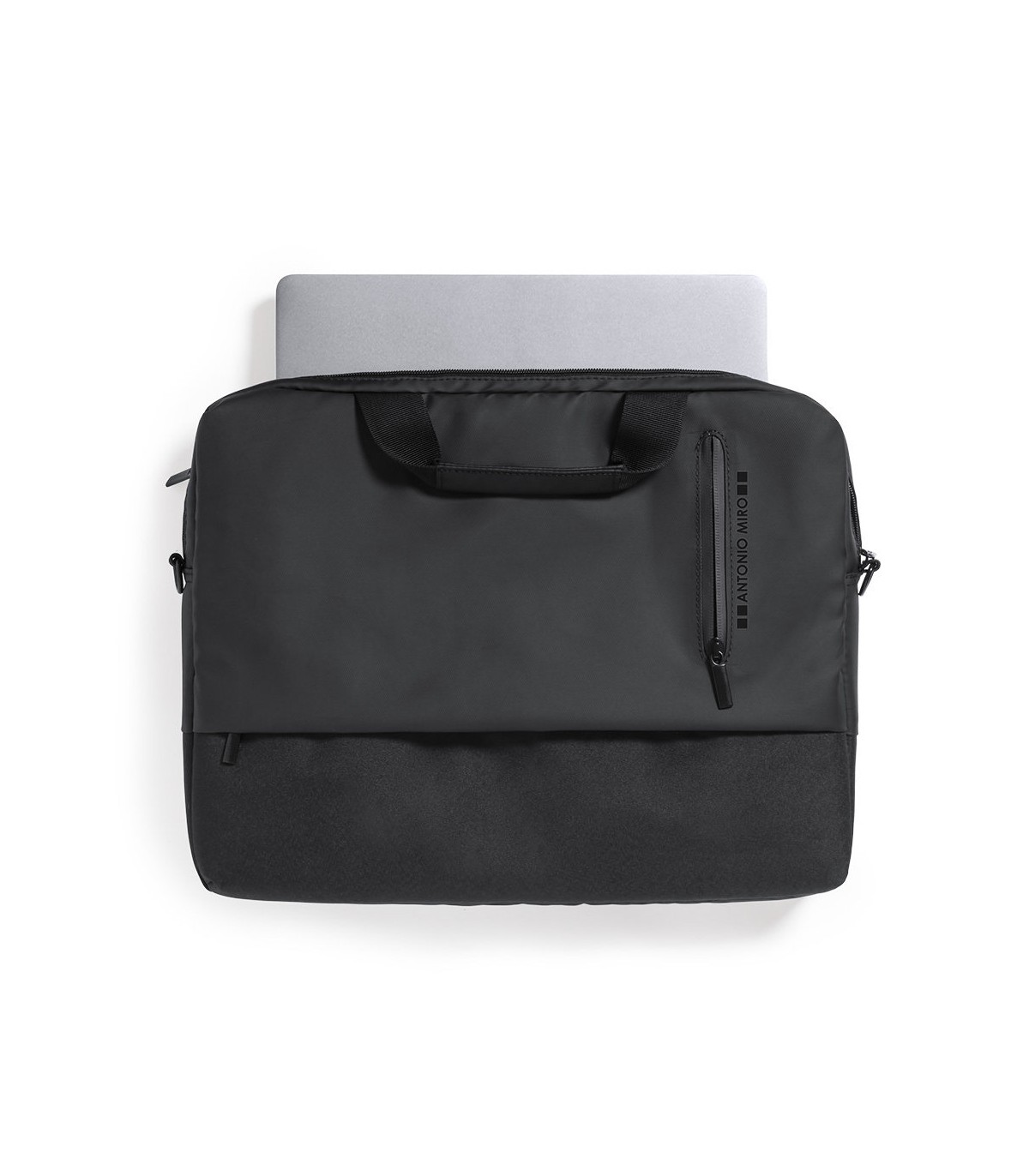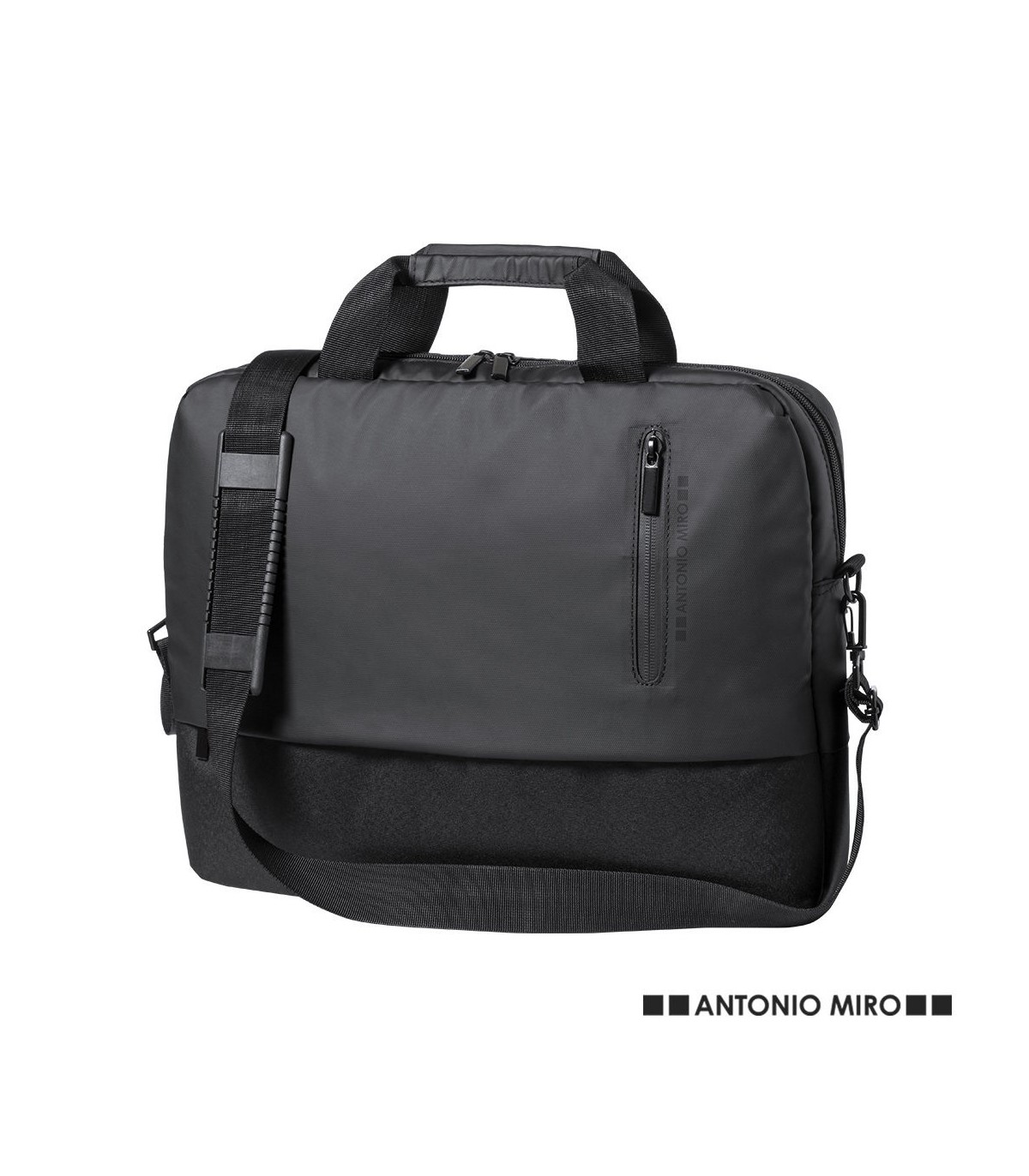 Maletín de Antonio Miró de calidad premium en resistente poliéster 600D. De sobrio diseño y con compartimento acolchado para portátil de hasta 15 pulgadas. Con cómoda asa de transporte reforzada, cierres de cremallera con tiradores metálicos y bolsillo frontal. Logotipo de la marca en frontal.