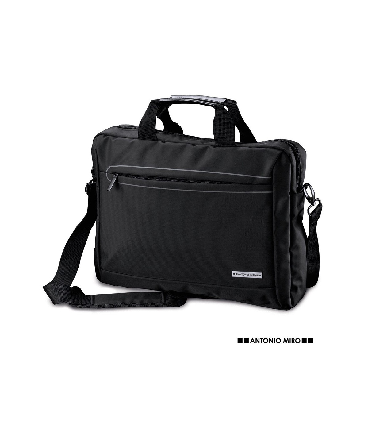 Maletín de Antonio Miró de alta calidad con cierre de cremallera y bolsillo frontal en resistente y suave nylon. De sobrio diseño y con compartimento acolchado para portátil de hasta 15 pulgadas. Incluye cómodas asas de transporte reforzadas y cinta bandolera ajustable a juego con refuerzo acolchado para hombro y cierre de mosquetón. Logotipo de la marca en chapa frontal.