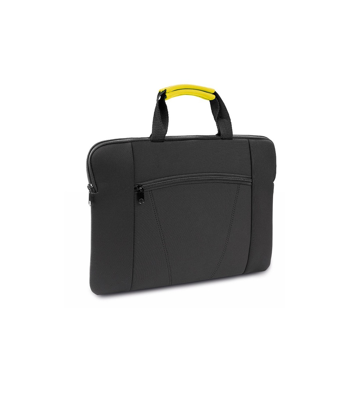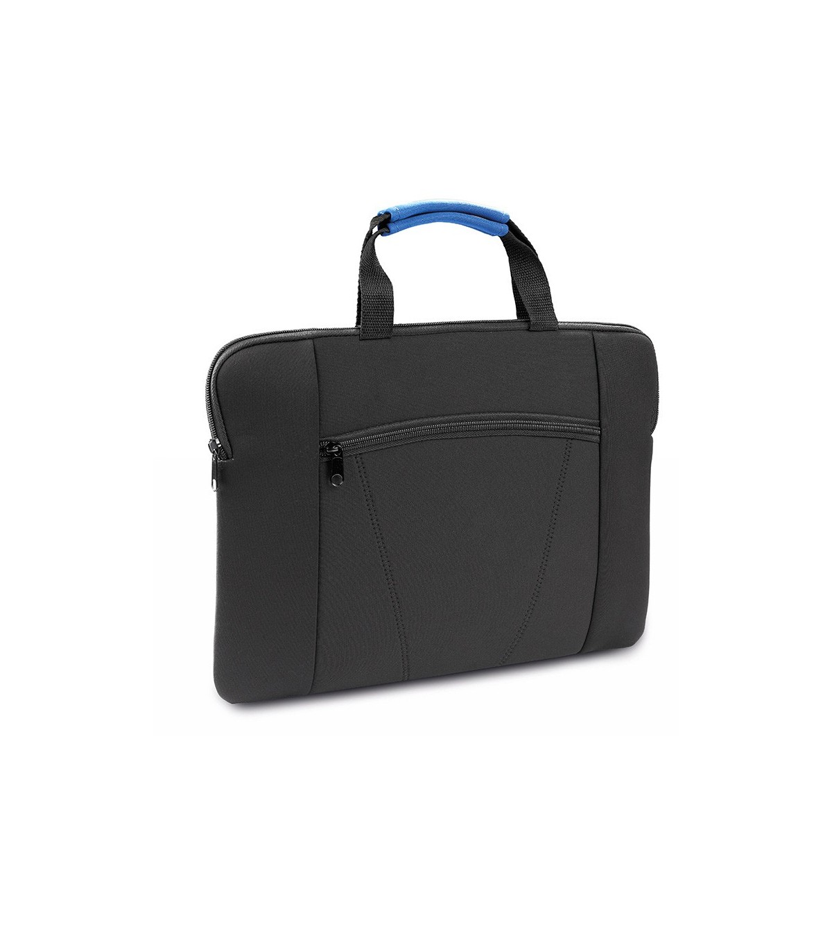 Resistente portadocumentos de soft shell con cierre de cremallera y bolsillo frontal. En elegante acabado de color negro y refuerzos en color en las asas.