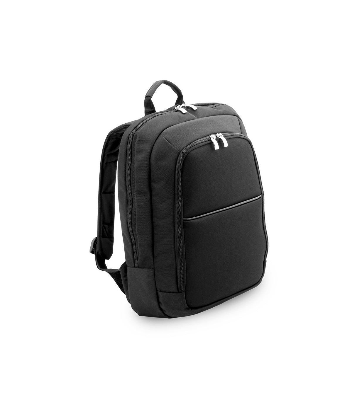 Mochila de resistente nylon 900D de sobrio diseño con cierre de cremallera, bolsillo frontal y asa reforzada. Con acolchado en espalda y cintas de hombros, incluye compartimento interior acolchado para ordenador portátil de hasta 14 pulgadas.