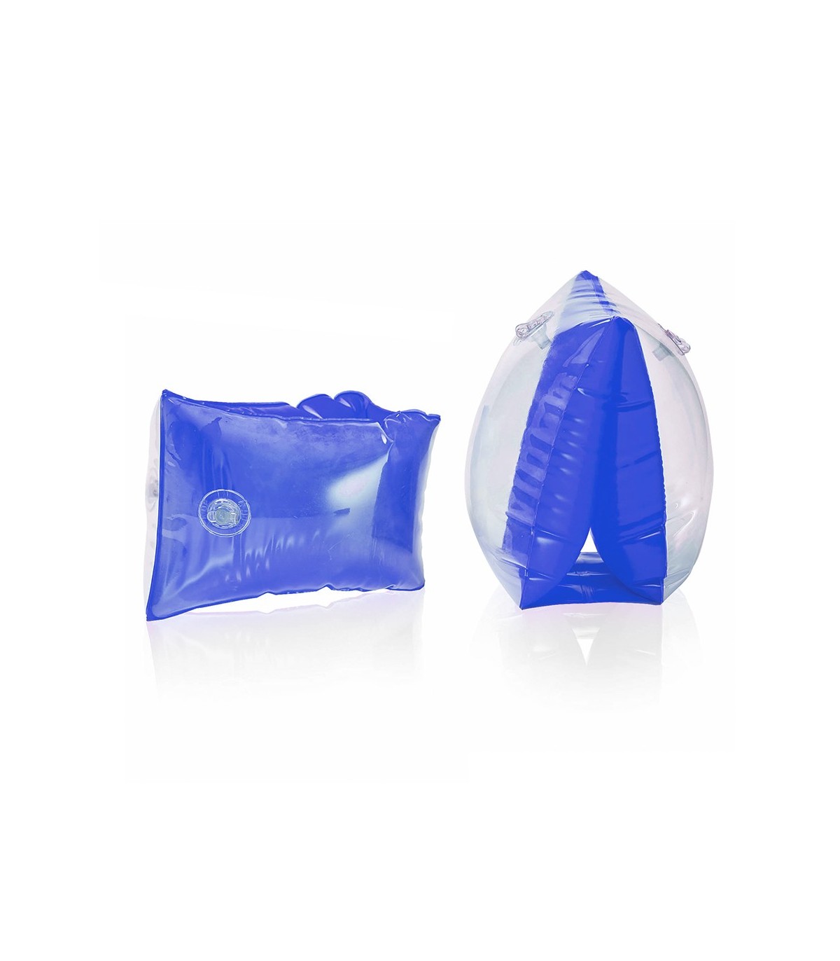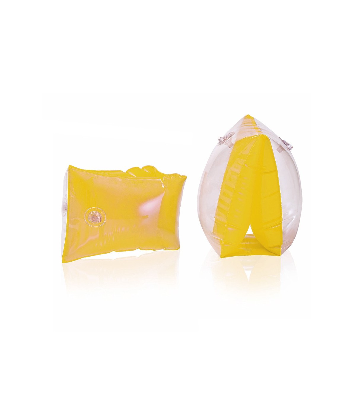 Par de manguitos inflables en PVC con cuerpo en combinación de tonos translúcidos y vivos colores sólidos.