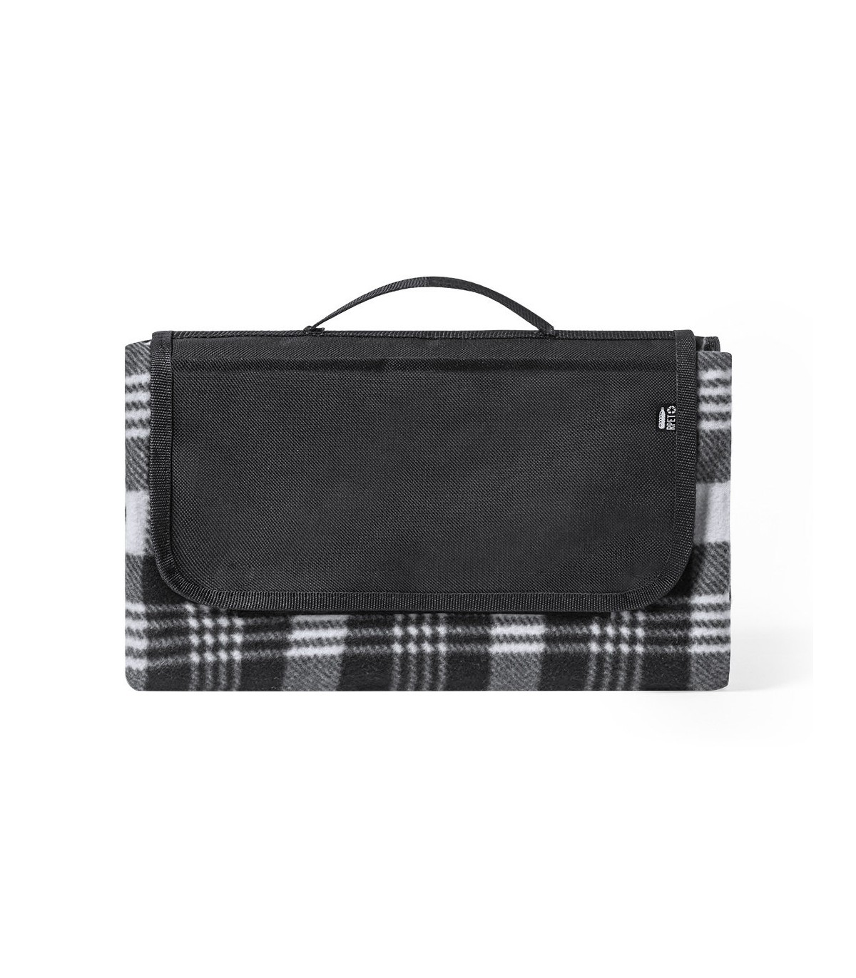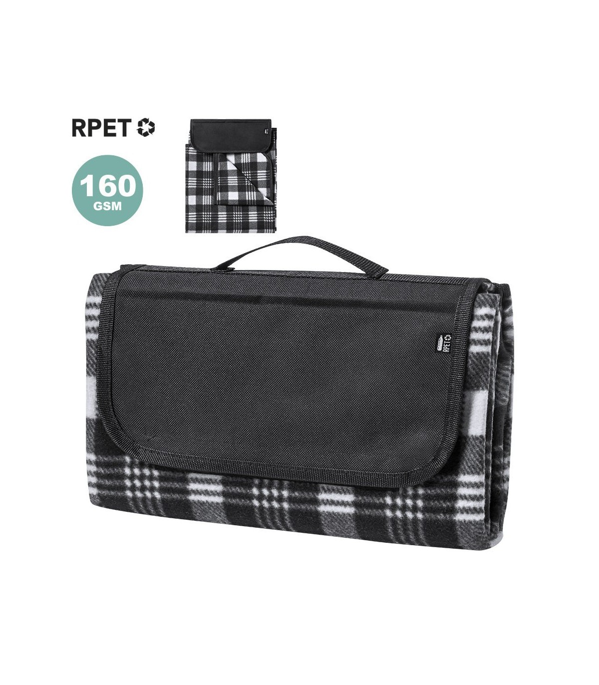 Manta de picnic de calidad premium, elaborada en poliéster RPET de 160g/m2, elaborado a partir de plástico reciclado para así fomentar la reutilización de residuos plásticos y contribuir a la sostenibilidad del planeta. Medidas 120x150cm, con lado para sentarse en patrón tartán bicolor de suave tacto. Lado en contacto con el suelo en resistente PEVA. De fácil plegado y de tamaño compacto, incluye asa de transporte y solapa con cierre de velcro, con distintivo RPET en etiqueta.